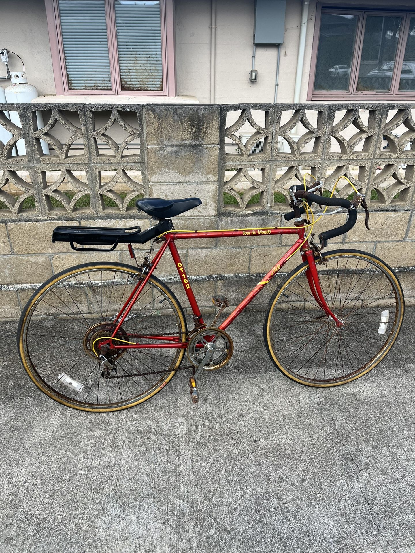 Vintage Tour Du Monde GT162 road bike with bike rack. Great for touring or just riding around! Rides great, tires hold air and breaks work as well. Besides the cosmetic rust it’s a great vintage road bike and a fun ride!