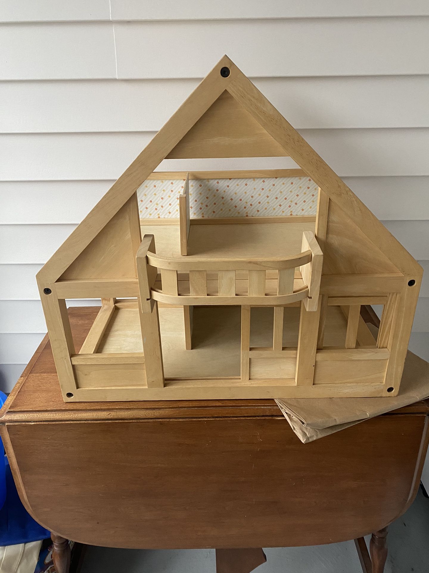 PlanToys Wooden dollhouse PlanToys wooden dollhouse with sliding doors. The balcony can be removed as well. The dollhouse is a great size, not too heavy. (Dolls and accessories are NOT included) There is a small piece missing in the back of the dollhouse as shown in the picture but it is barely noticeable, still in great condition. Originally $200, asking for $150 obo. Pickup is at the cvs by Dundee and old Buffalo grove. 22.6 L x 13.8 W x 24.6 H