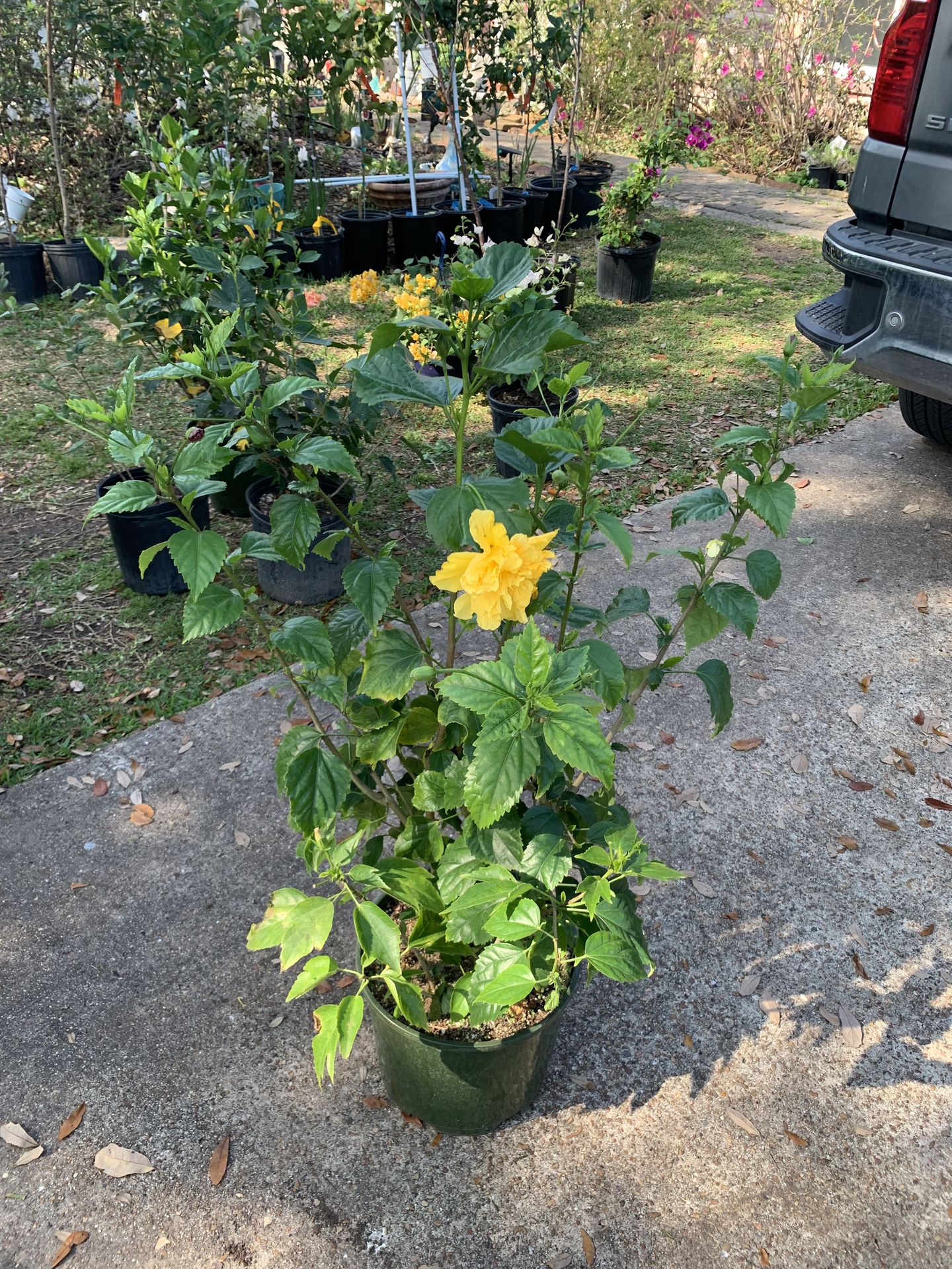 Beautiful and healthy Yellow double hibiscus plant 2 plants in container red and yellow 2 gallons Over 2 feet tall Partial shade Now blooming Low maintenance Only 35