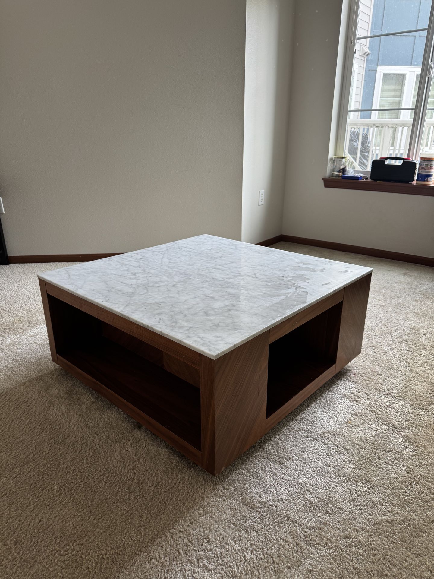 CB2 Marbel Coffee Table: • Designed by VUUE • Carrara-style white marble with grey veining • Solid yellow poplar, engineered wood and walnut veneer • Wipe with a soft, dry cloth; no abrasive cleaners • Coasters recommended • Made in Vietnam Overall Dimensions Width: 91.44cm Height: 43.18cm Depth: 91.44cm Pick up in Renton 🙏
