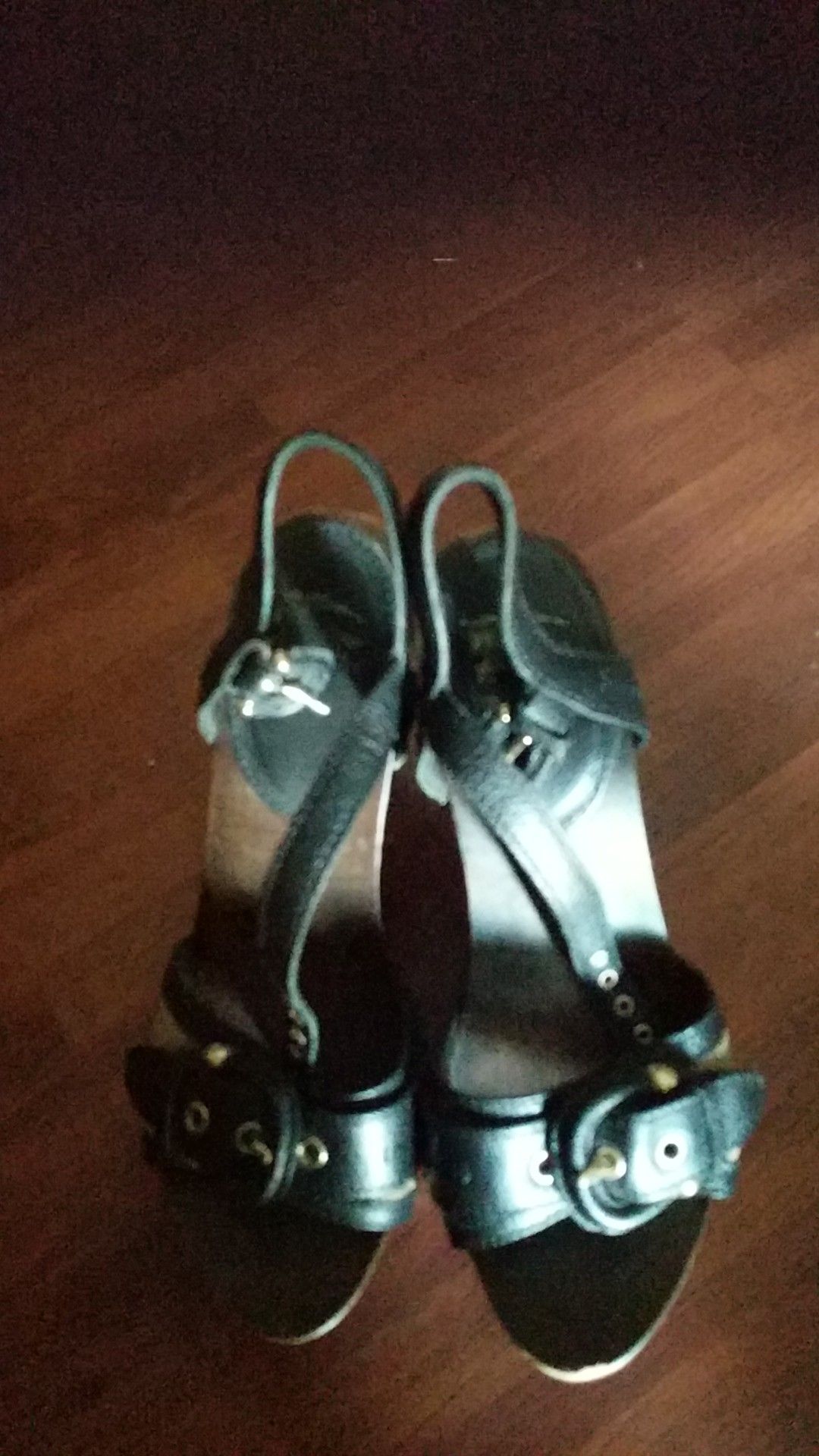 Beautiful Burberry sandals ankle straps with signature buckle across toe area. Size 10 Wooden thick heel for added comfort. True to size. Small chip in wood but can't be seen when shoes are worn. Excellent used condition.