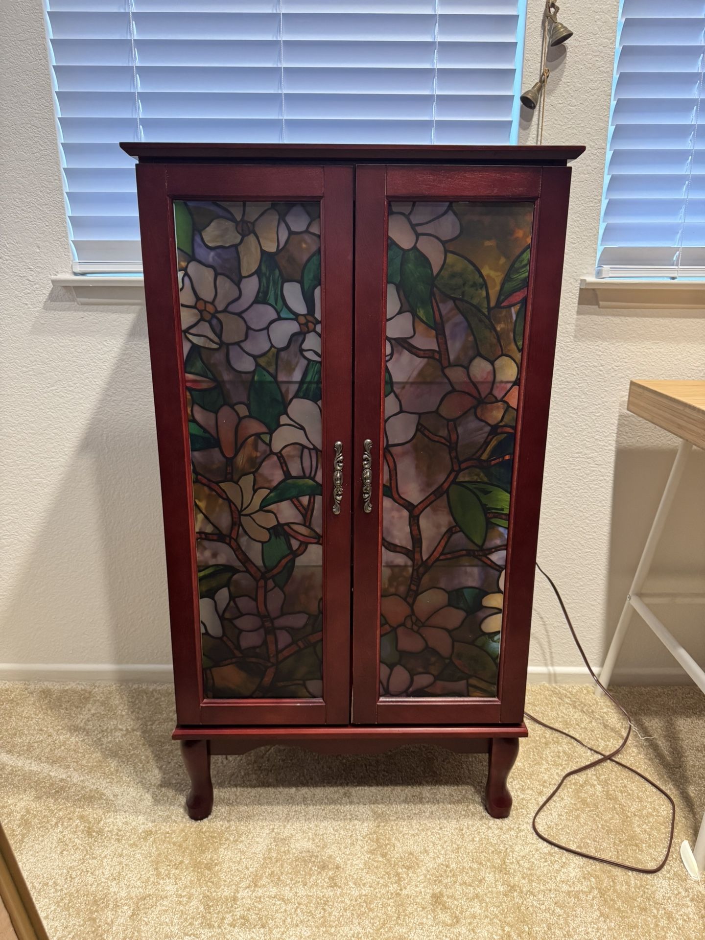 Red wood display cabinet that lights up inside. The faux stained glass is very easily removable (and cheap if you wanted to add more to the sides). Mirrored back and glass shelves inside MEASUREMENTS: 43 in H x 24 in W x 12 in D