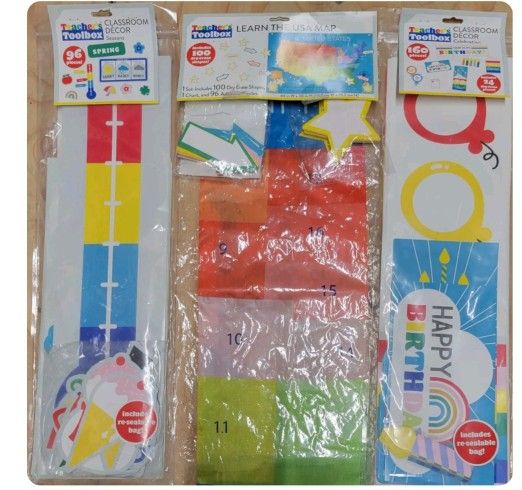 Lot Of 3 Teachers Toolbox Classroom Sets New With Tags. ■ Learn The USA Map With 100 Dry Erase Shapes, 1 Chart, 96 Adhesive Circles 44" Width × 30" Height. ■ Birthday Decor 160 Pieces 24 Dry Erase Pieces Bulletin Border Set 2022. ■ Seasons Decor 96 Pieces Spring ,Sumner,Fall,Winter Bulletin Board Display Interactive. We Are Happy To Offer Combined Shipping If You Purchase More Than One Item.