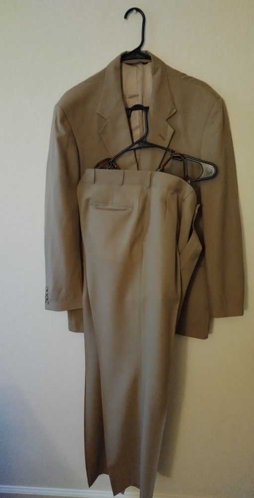 Camel brown color suit Suit jacket size is 42R and pants size is 36/32 this suit is crafted from the finest material's ...this suit is still new just worn one time..