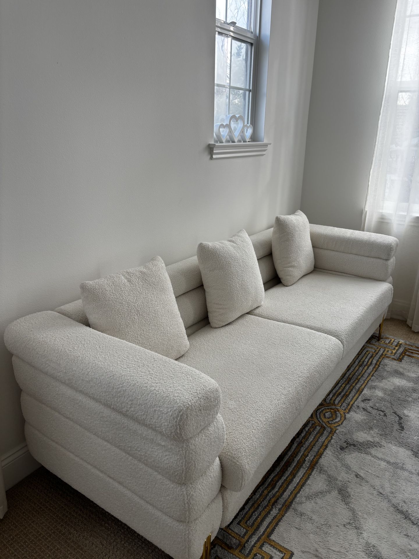 Beige / off white textured couch with gold detailing. Includes 3 pillows. 1 year old. No Stains. Original price $530.