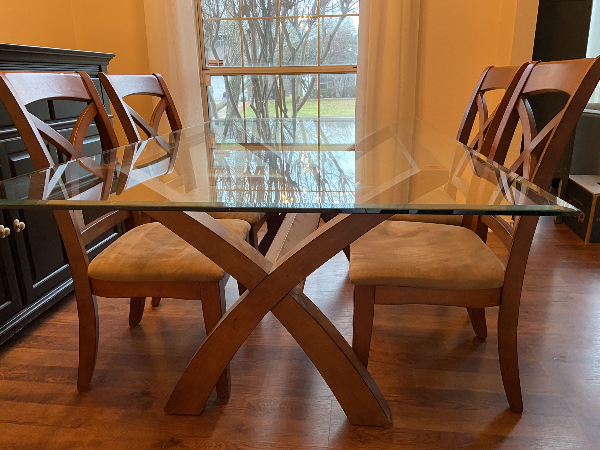 Wood base with glass 46 X 76” top. There are 8 chairs with it. The set is about 10 years old but in great condition. It’s too big for our space. It came with 4 chairs, I added 4 more. Over $1500 invested