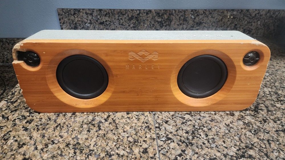 Bluetooth speaker Marley get together Has seen better days but the sound is amazing. Not original charger. Everything works as it should. Its banged up and dirty. If you do wood work, or have a good cleaning system you can restore this.