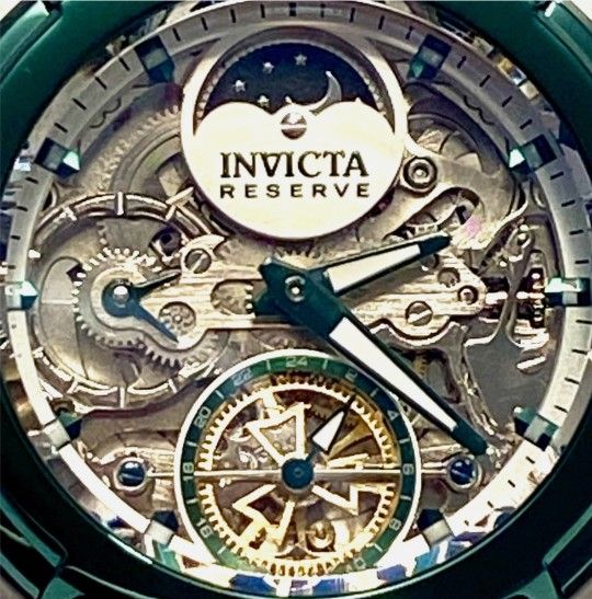 22 Jewel Movement. New With Box & Papers. Invicta Reserve Collection “X-Wing” Coalition Forces, Fully Skeletonized Dial with green accents featuring Day/Night Indicator @12:00, 24-hour Subdial @06:00, 2nd Time Zone Subdial @09:00, silvertone with Green accents stainless steel 46mm /52mm external case (19mm thickness) Case, Z-2031 Automatic self-winding 22 Jewels movement, silvertone with Green center links stainless steel bracelet, exhibition backCase, W.R. 300 meters, Mens Watch