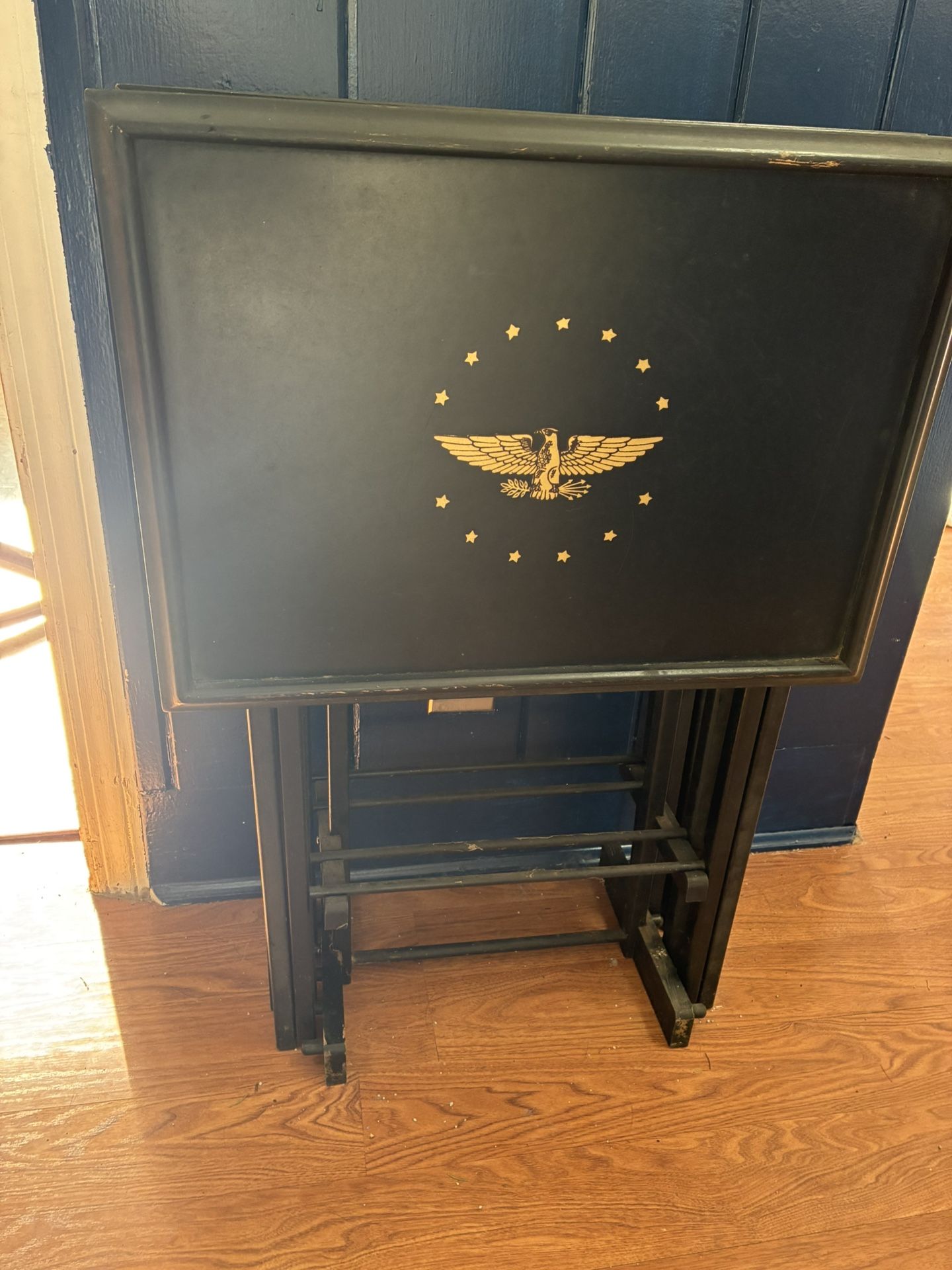4 folding tables, with rack. Artex gold eagle and stars on black tables. Fair condition