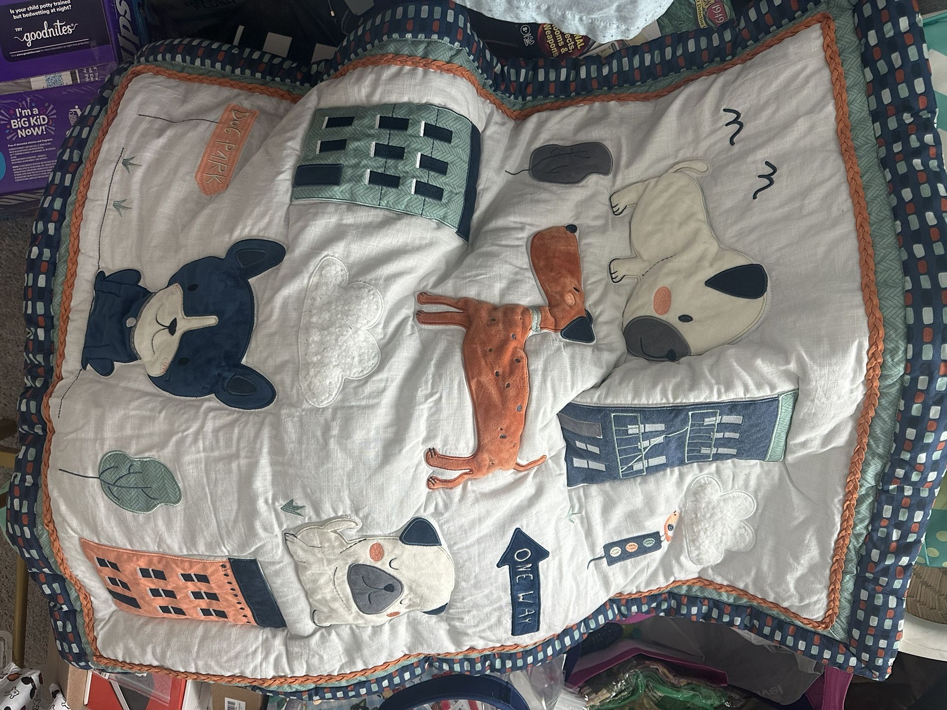 Crib quilt dust ruffle and mobile no stains very gentle used.