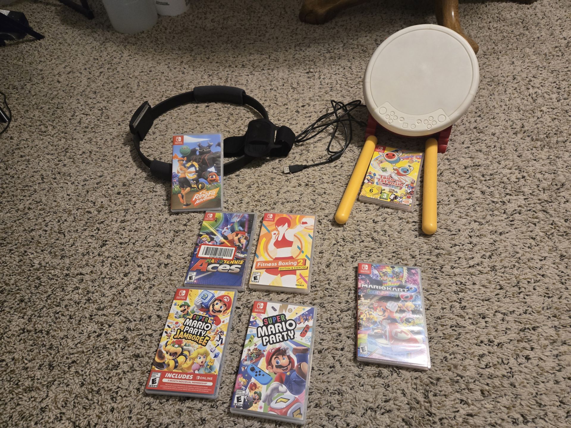 Ring Fit Adventure with Accessory $50 Mario Tennis Aces SOLD Fitness Boxing 2 $20 Super Mario Party Jamboree SOLD Super Mario Party SOLD Mario Kart Deluxe 8 SOLD Taiko no Tatsujin Drum n Fun with Drum $85 Or buy everything listed unsold for $145.