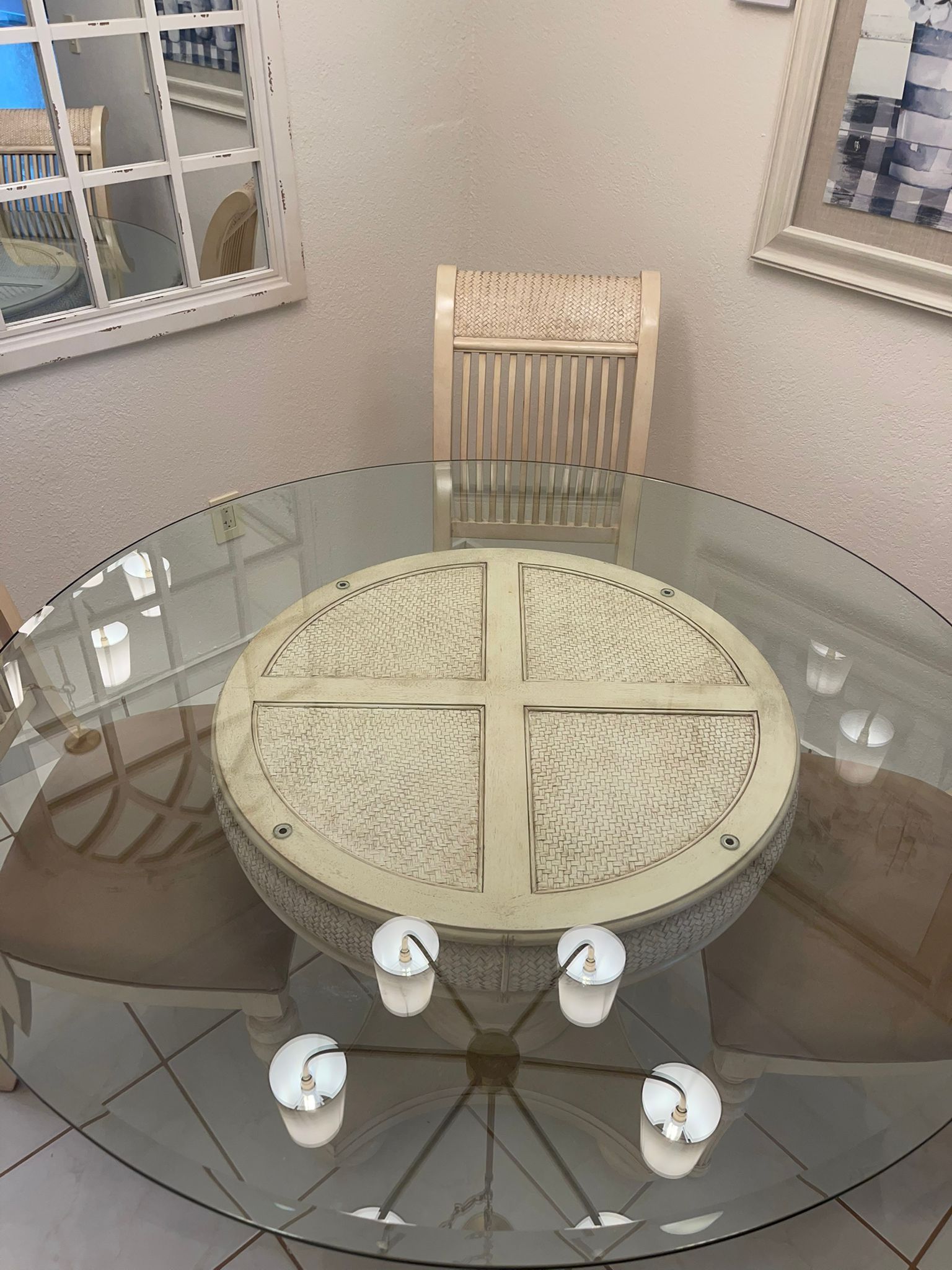 Beautiful wood table with rattan-style chairs, full of charm and in excellent condition. No stains, no damage, non-smoking home. Downsizing, so our loss is your gain! Barely used as owners were travelers. Perfect for family dinners or cozy gatherings.