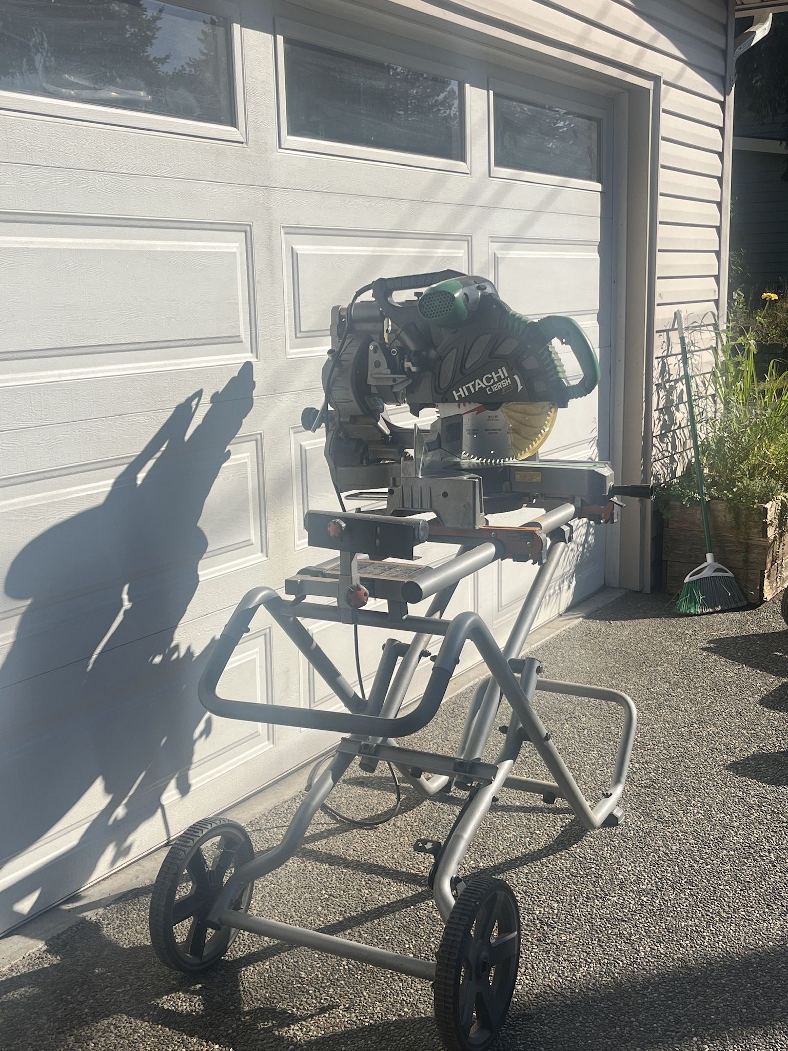 Hitachi C12RSH 12” Compound Miter Saw mounted on Ridgid MS-UV (Miter Saw Utility Vehicle) stand. With laser. Is in good shape. I’m moving and can’t take it with. Sold together. Located in Tukwila near I-5 and 518.