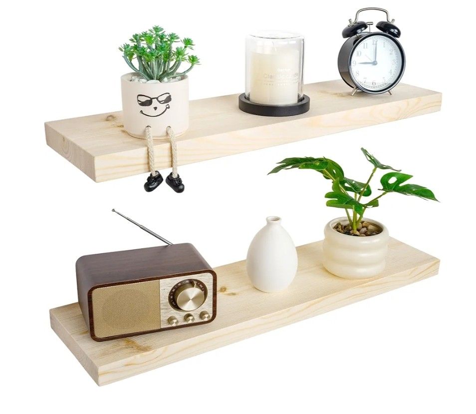 NO SAGGING! MORE PERFECT FOR AMERICAN WALLS : BGMG premium wood shelves are built to last and hold up to 50 pounds using our smart brackets designed specifically for American wall studs, which are typically 16 inches apart! The brackets warp slightly upward to prevent the shelves from sagging and falling off! PERFECT SIZE: Each floating shelf is 6.7 inch deep, which means they can hold most books without taking up too much space. It makes full use of empty walls and makes the room look bigger and neater MODERN RUSTIC LOOK - The floating shelves are made of natural pine, and the wood has different nodes and grains, so the color of each shelf may be slightly different, but equally stunning MULTIFUNCTIONAL DECORATIVE SHELVES: Modern rustic style floating wall shelves are suitable for a variety of scenarios. Use it in the kitchen to store spices, bottles, cups; install it in the bathroom to store shampoo, conditioner, body wash and more. Also perfect for bedroom, living room, office, etc., beautiful and space-saving EASY TO INSTALL: These floating shelves come with stainless steel galvanized invisible brackets, toggle bolts for drywall, and simple instructions to help you install them. These wall shelves are easy to assemble, requiring only two boards and the necessary screws and hardware. We also provide detailed instructions for quick and easy assembly...4520