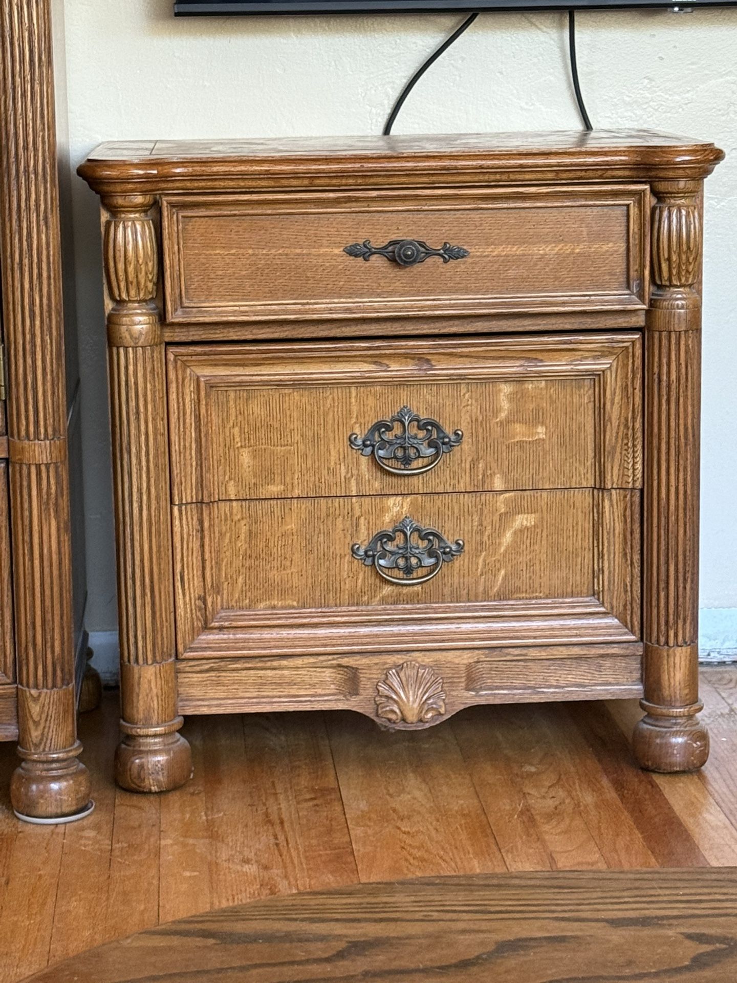 Beautiful solid oak queen-size bedroom set featuring classic carved details, turned posts, and rich natural oak grain. This is a high-quality, heavy, real-wood set — not veneer or MDF — built to last for decades. The set has been recently refreshed, including a newly replaced back panel for clean appearance and structural integrity. Overall condition is very good with normal light wear consistent with careful use. Includes: • Queen-size bed frame (headboard, footboard, side rails) • Matching nightstand • Matching wardrobe cabinet with mirror Details: • Solid oak construction • Traditional, timeless design • Sturdy and well-maintained • Mattress not included Price is negotiable at pickup. Pickup only. Serious buyers welcome.