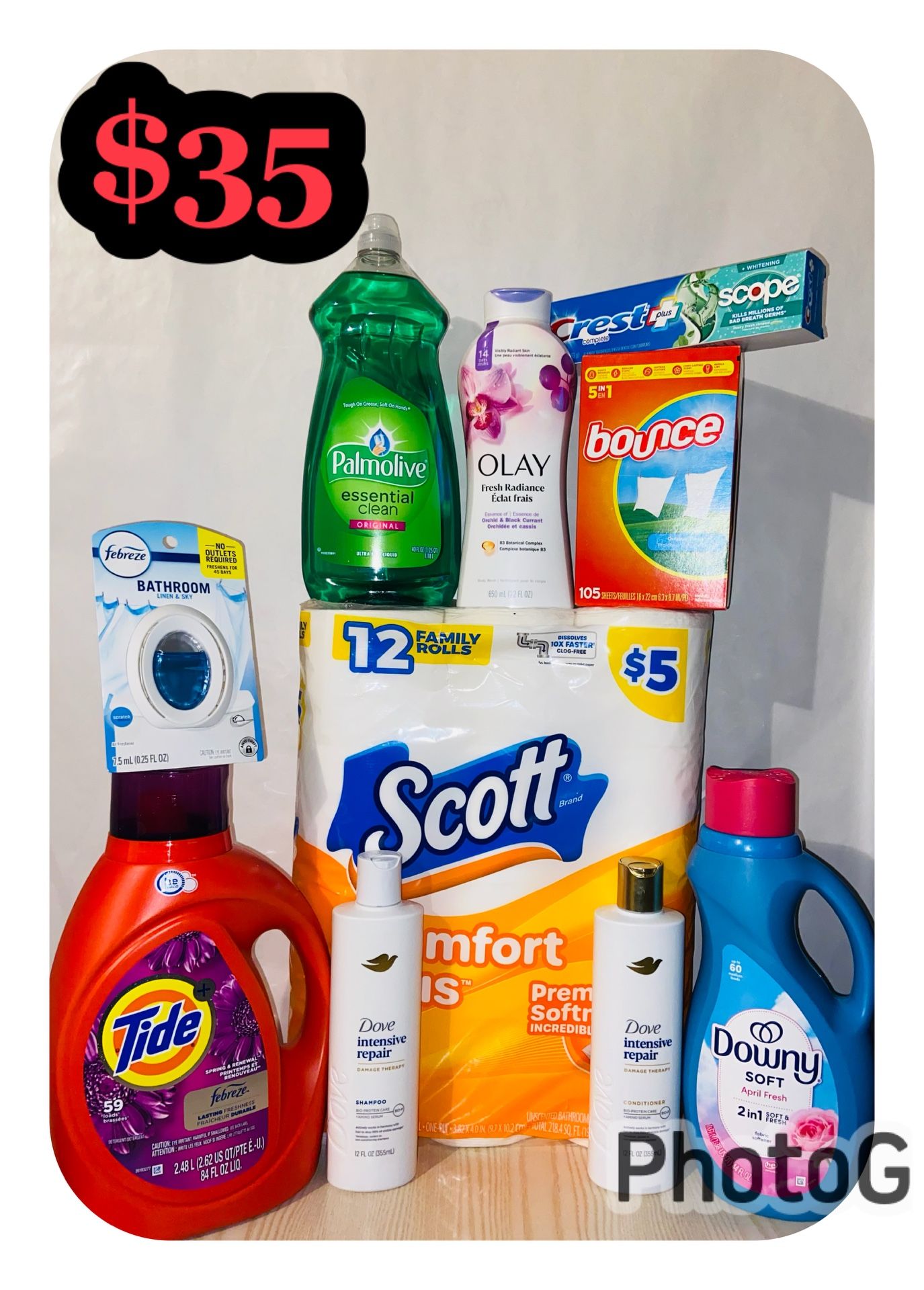 $35 for all ❇️Cash Only ❇️Band new‼️ 1 Tide liquid 84 oz 1 Febreze small spaces 1 Dove shampoo 12 oz 1 Dove conditioner 12 oz 1 Downy fabric softener 44 oz 1 Scott toilet paper 12 rolls 1 Palmolive dish liquid 40 oz 1 Olay Body Wash 22 Oz 1 Bounce 105 ct 1 Crest toothpaste 5.4 oz