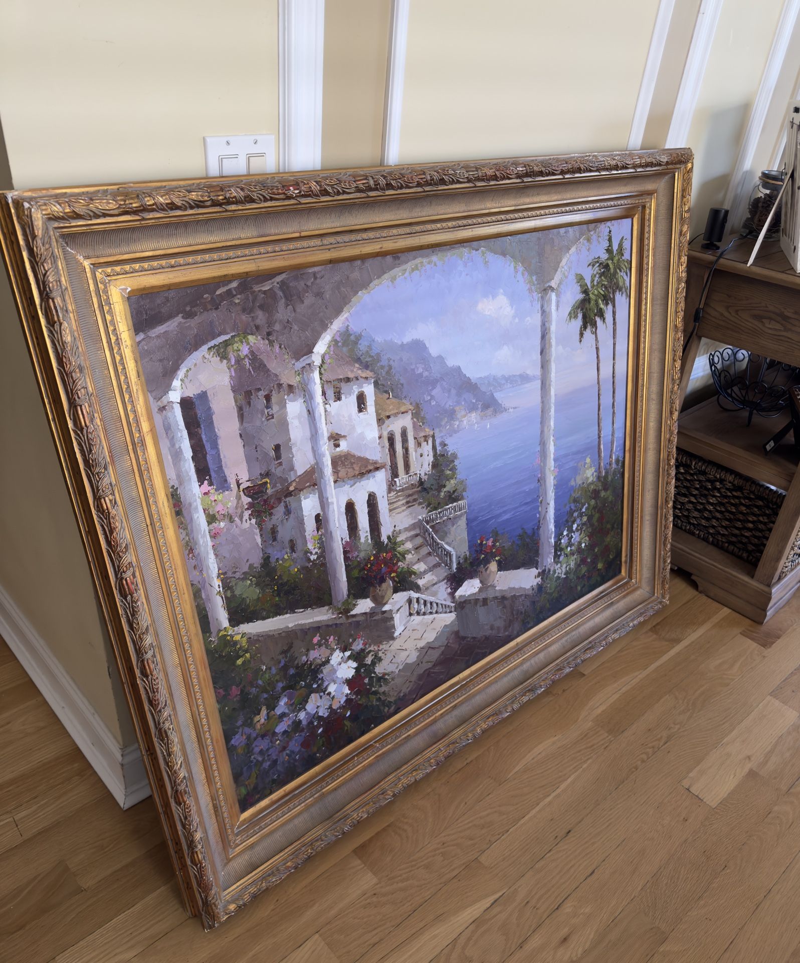 Mediterranean coastline - Framed with an intricate and heavy wood frame 57 x 46 in Minor damage on the frame