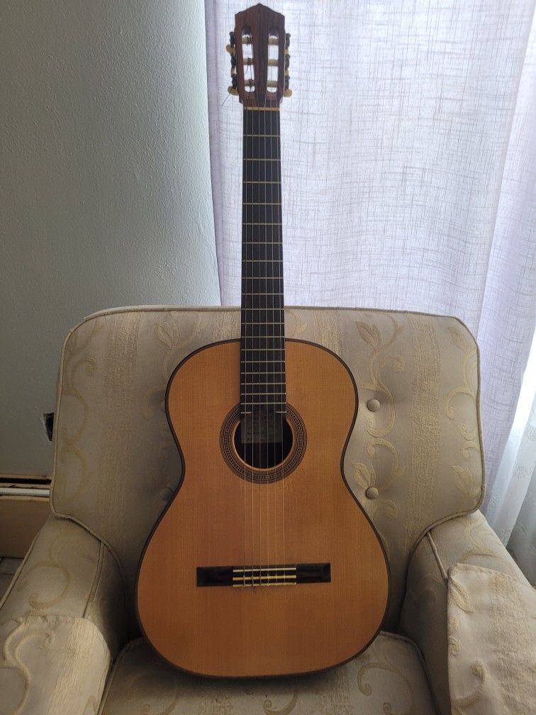 This 62 year old classical concert guitar made by one of the most recognized worldwide Luthiers, Manuel Velazquez, made of Dark Brazilian Rosewood Spruce and considered one of the best known for its quality and sound of the instrument. This guitar has been kept inside its original hard shell case and is in excellent shape.