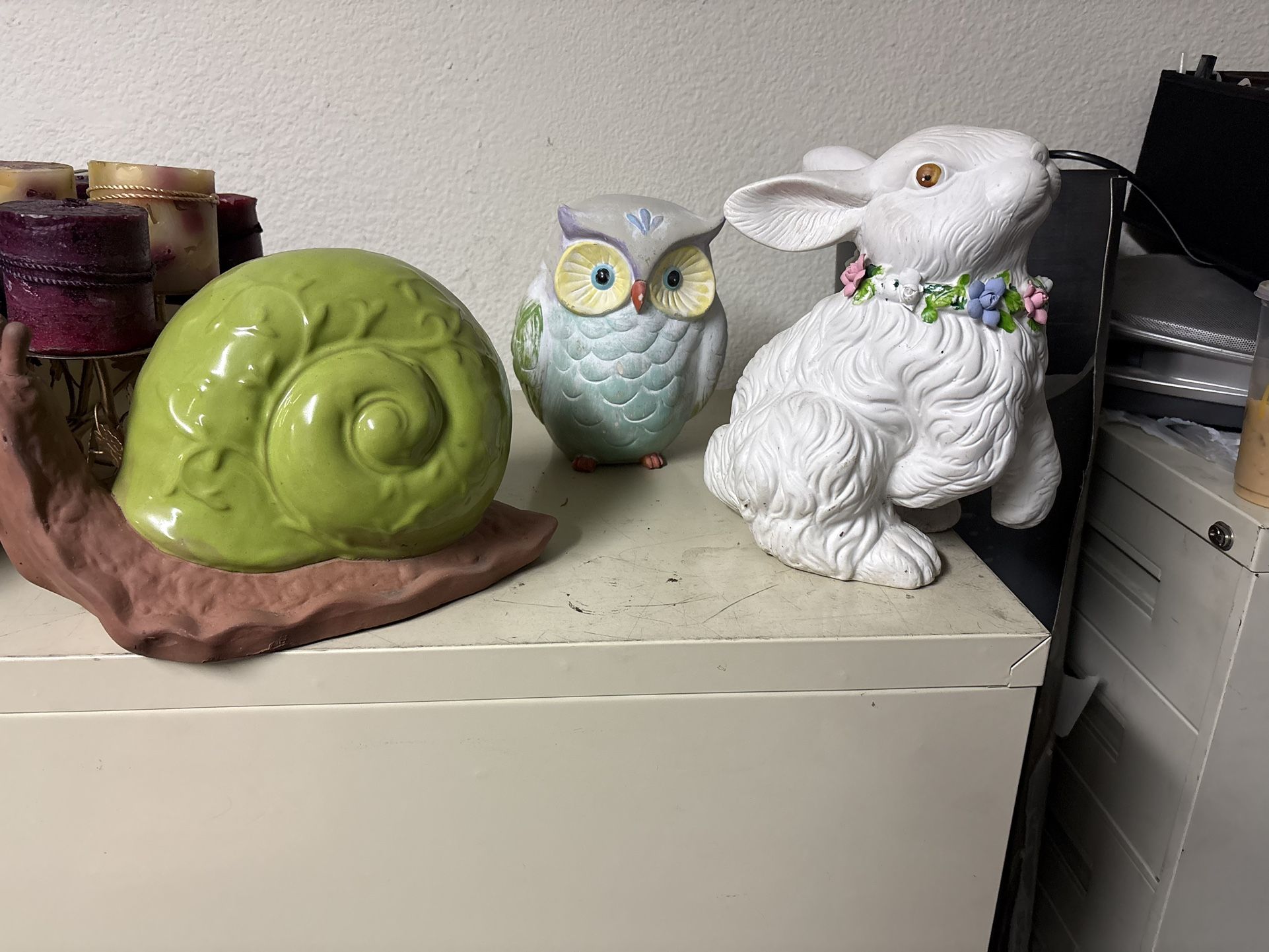 Cute set of 3 for this price. Has a green snail, light blue owl, and white bunny with a flower collar. Great for garden or home decor.