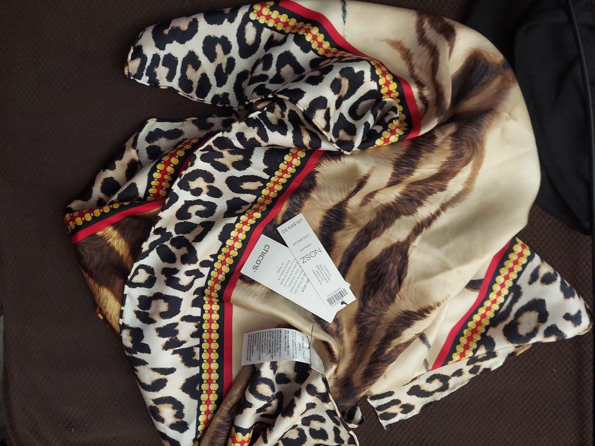 Cheetah pattern. Brand New with Tags. Never used Crafted of 100% silk, this item is unrivaled in color, comfort, drape, and texture. It's a luxury to wear. And a treasure to keep. Tiger essence silk scarf scarves square English toffee. (contact info removed)26.