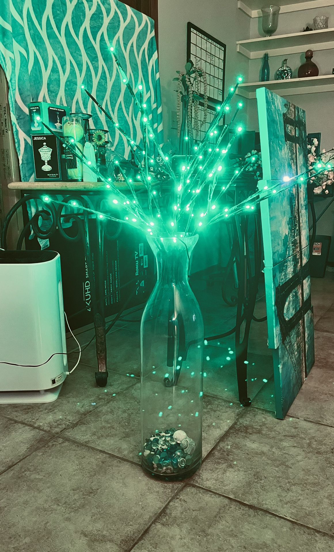 Great Shape - No nicks, scratches, or chips. It stands 25”Hx7”W, Diameter 21 3/4”. Selling with 1 Christmas branch w/bright green solid and white blinking lights. Also comes w/2 branches of cherry blossoms. Nice addition to decor.