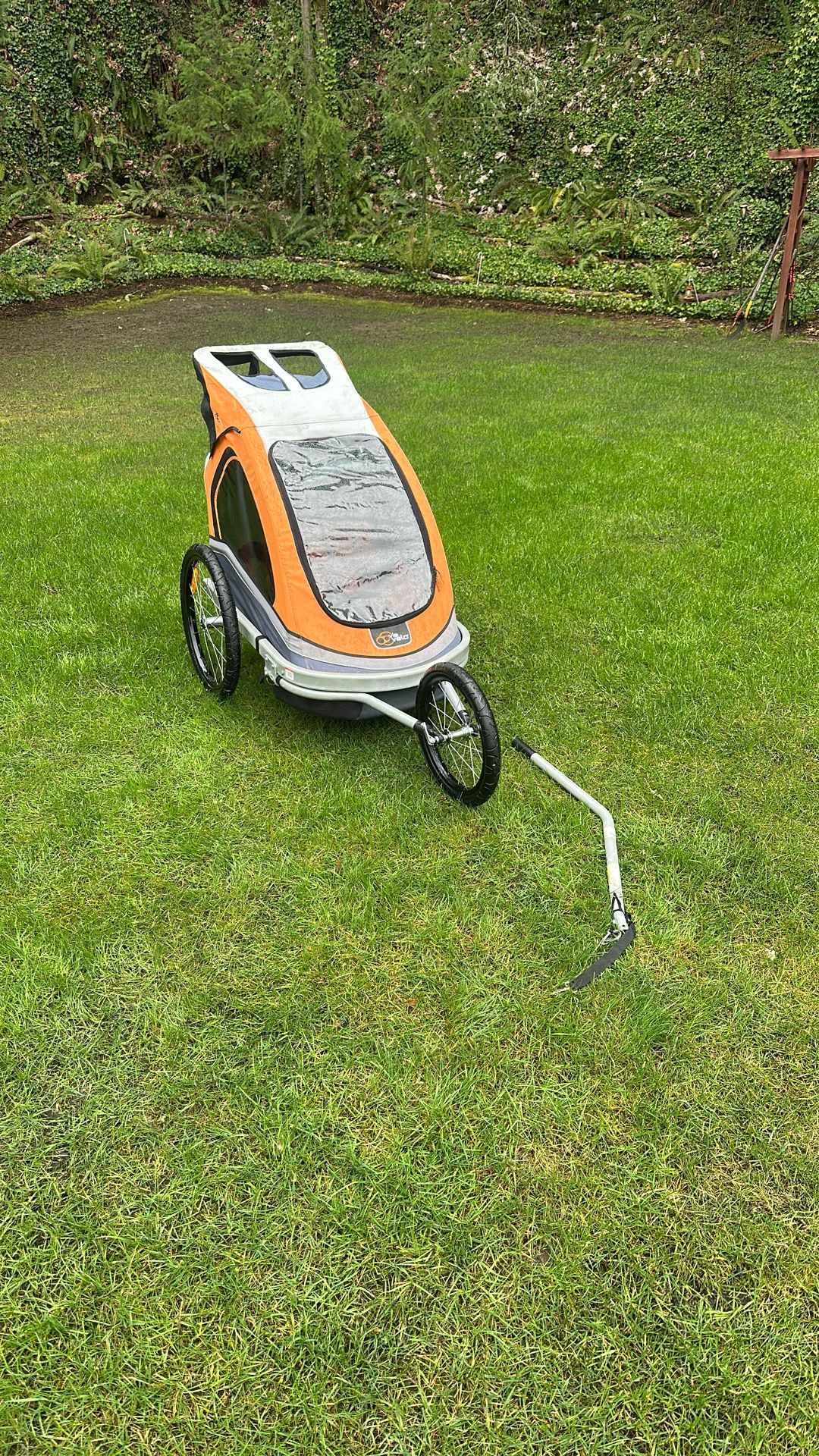 Via Velo, two in one kids, bike trailer and a stroller. 5 point safety harness for two children . Good size trunk for storage. Side storage pockets. It is in good shape. Tires are like new.