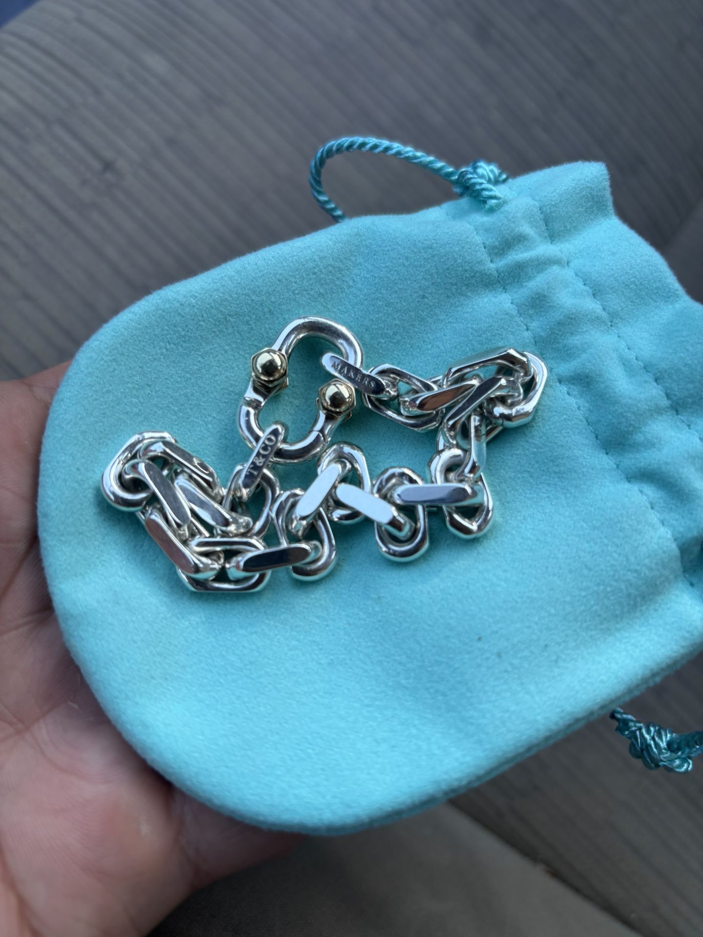 Selling for cheaper than the last two SOLD (not listed) prices on EBay (2/2/26: $1,399 & 1/19/26: $1,100) Fits my 7 inch wrist well. It’s not likely going to fit your wrist if your wrist is bigger than mine. Tiffany & Co. 925 Silver & 18K Yellow Gold Makers Bracelet (Retired Model) Comes with Tiffany & Co. Pouch. It was freshly polished by Tiffany & Co. Also including a Tiffany & Co. book