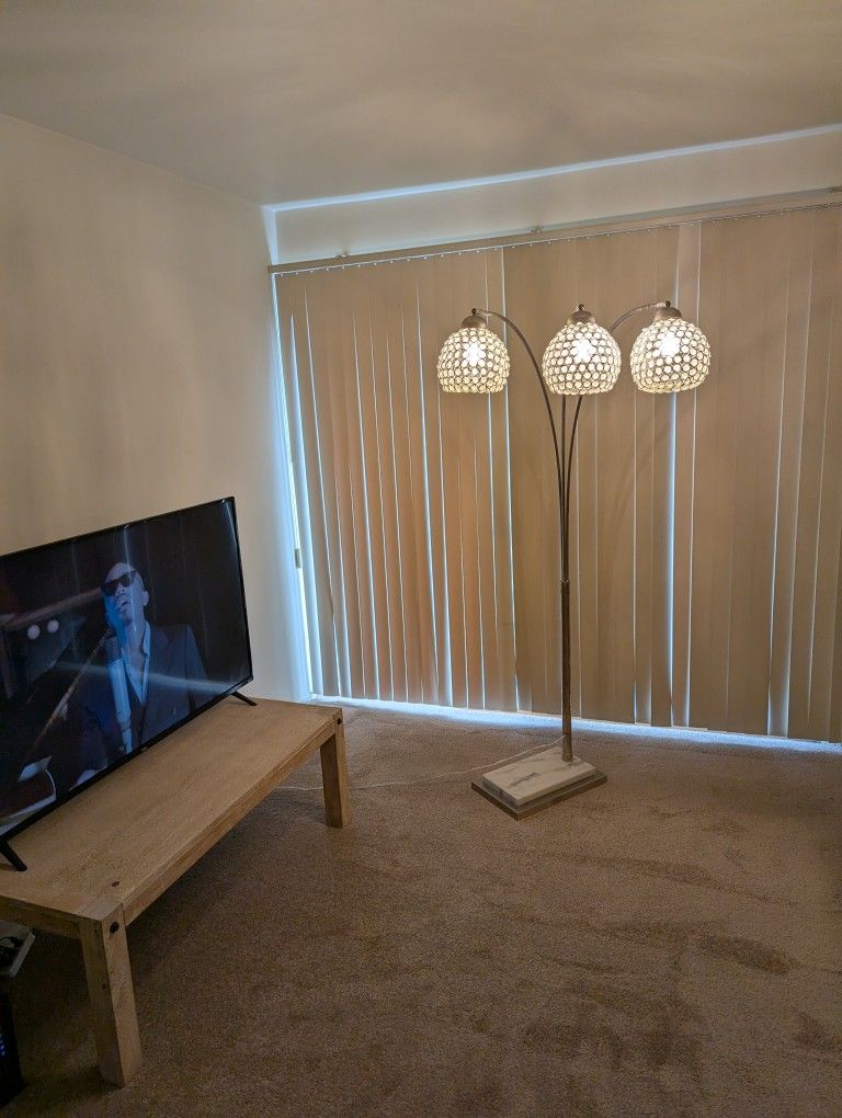 Dimensions: 55"W x 55"D x 73"H Perfect for towering over a sofa or chair or just a corner piece. A two-tiered square marble and metal base with polished metal body creates a spectacular look. The arc-style design features three gorgeous crystal dome lights. Note: This is a heavier lamp and needs to be picked up from my apartment on the 1st floor (13 steps staircase)
