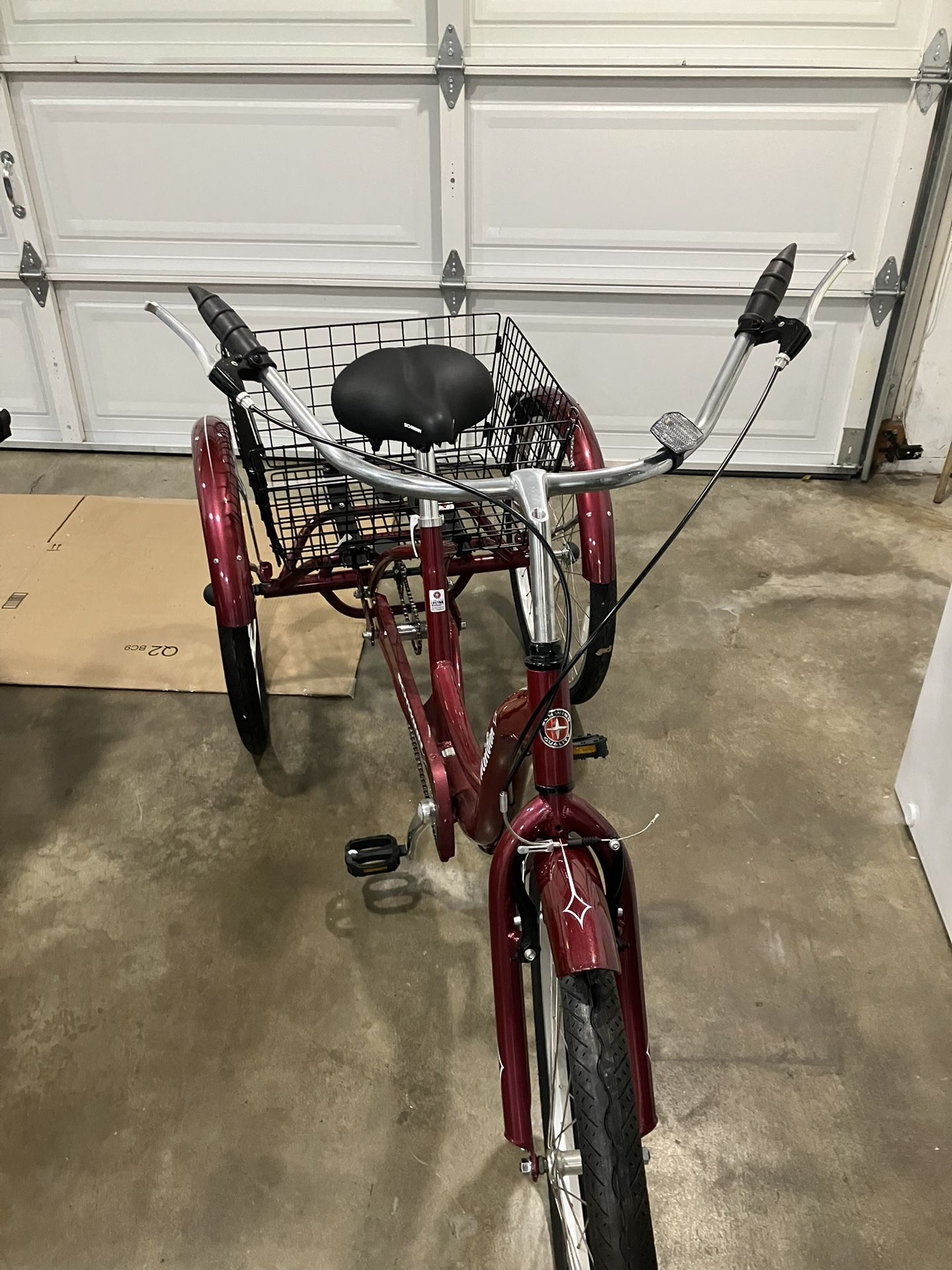 Brand new never used bicycle. This gorgeous adult tricycle is a deep burgundy red color. Currently selling for $580 at Target 26” bike Single-speed drivetrain for simple, carefree riding Front V-brake and rear band brake combine for confident, controlled stopping Classic cruiser styling features full-wrap fenders and sweptback handlebars that keep you upright for a more comfortable ride Huge rear basket is perfect for hauling a picnic for the family or groceries for the week Dimensions (Overall): 76.0 Inches (L), 40.0 Inches (H) x 31.0 Inches (W) Weight: 70.0 Pounds Holds up to: 250 Pounds Features: Adjustable Seat Height, Quick Release Seat Suggested Age: 15 Years and Up Rear Wheel Diameter: 26.0 Inches Bicycle Frame Material: Aluminum