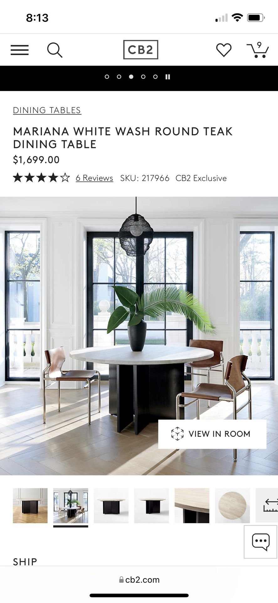 Dining table Mariana white wash teak 60” round new $1699 + tax! Selling $1350 OBO Table has minor scratch as pictured can be fixed easily with wood putty Not in any hurry to sell so low ball offers will be disregarded . SERIOUS INQUIRIES ONLY NOTE I ENCOURAGE TO GO TO Cb2 WEBSITE ALL DIMENSIONS AND PICTURES AVAILABLE THERE BY NAME I’VE PROVIDED North Aurora near Orchard rd and 88 Eventually looking to replace with a large oval table to seat more. Check out my other listings