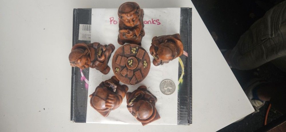 Vintage wax figurines, six total pieces. German monks playing poker.