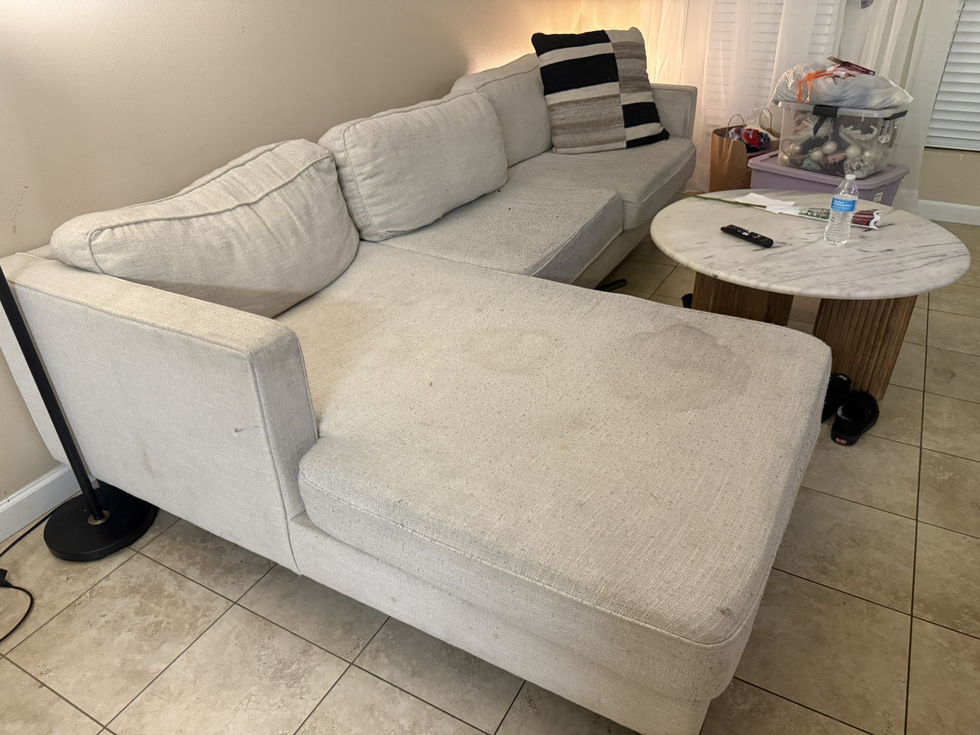 Just dirty, no rips or tears. Perfect condition other than it needs a full deep clean. Must pick up.