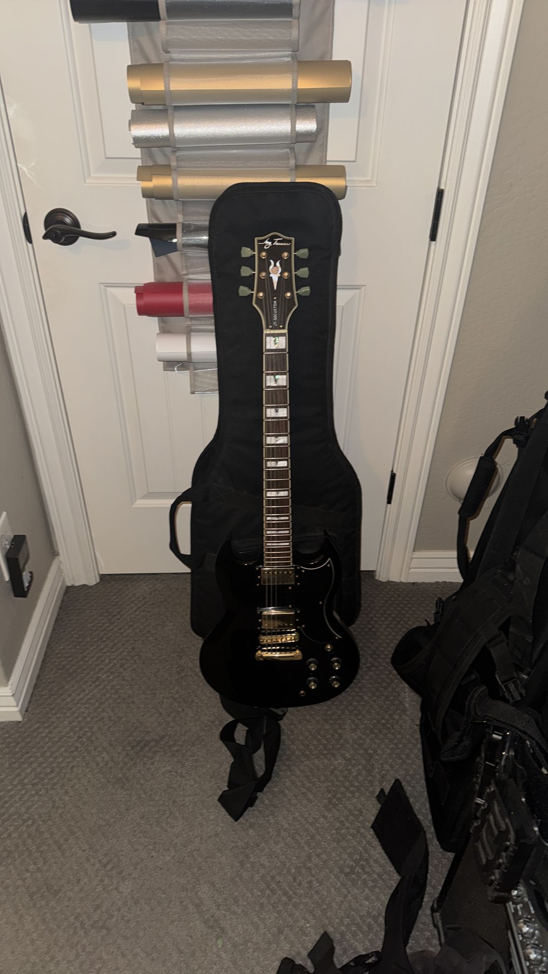 Jay Turser SG-style electric guitar in black with block inlays and gold hardware. Comes with soft padded gig bag. Lightweight double-cut body — very comfortable to play and great upper fret access. Features: • Dual humbuckers • 3-way pickup selector • Independent volume & tone controls • Classic rock / blues tone Good condition with normal cosmetic wear. Electronics work properly. Neck feels smooth and plays well. Perfect for beginner to intermediate players or as a solid backup guitar. Located in Gilbert. Cash preferred.