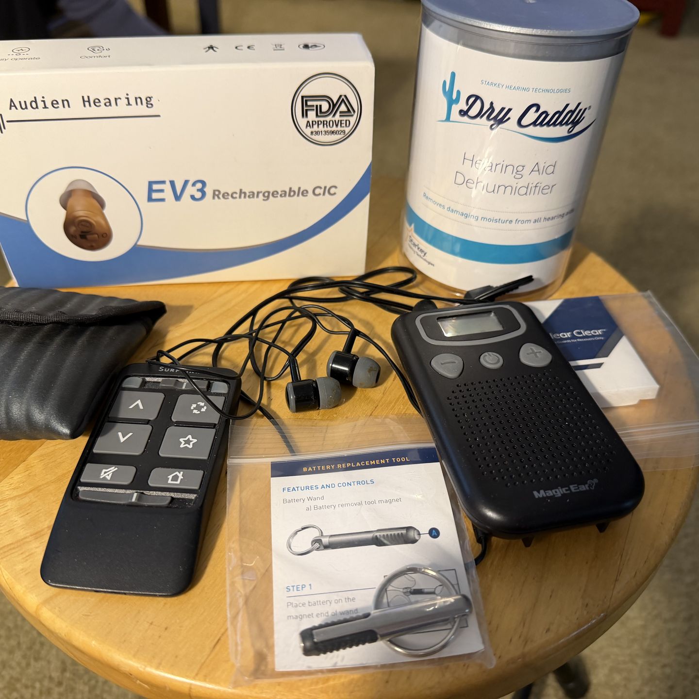 Includes: advanced remote control, charger, battery replacement tool,dry caddy-hearing aid dehumidifier. Works good for watching TV.