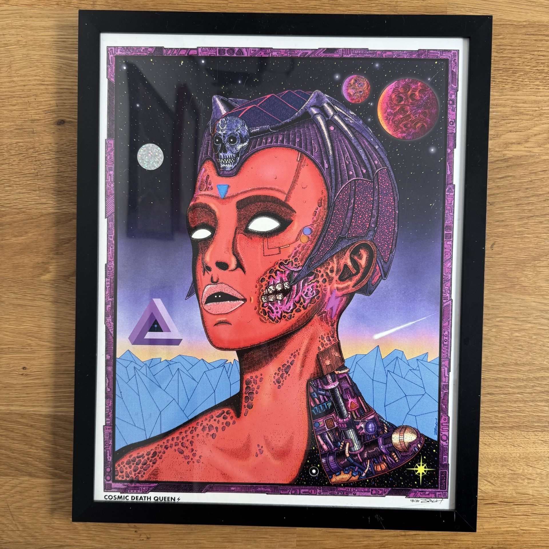 All but one come from local San Diego artists. Take em all for a discount. Guitar monster (shadow box frame) - $15 Cosmic death queen - $15 Hail The Sun skeleton album art - $10 Purple alien & square heads - $10 Trippy geometric drawing - $10 Red and blue geometry - $10 Empty black frame - free