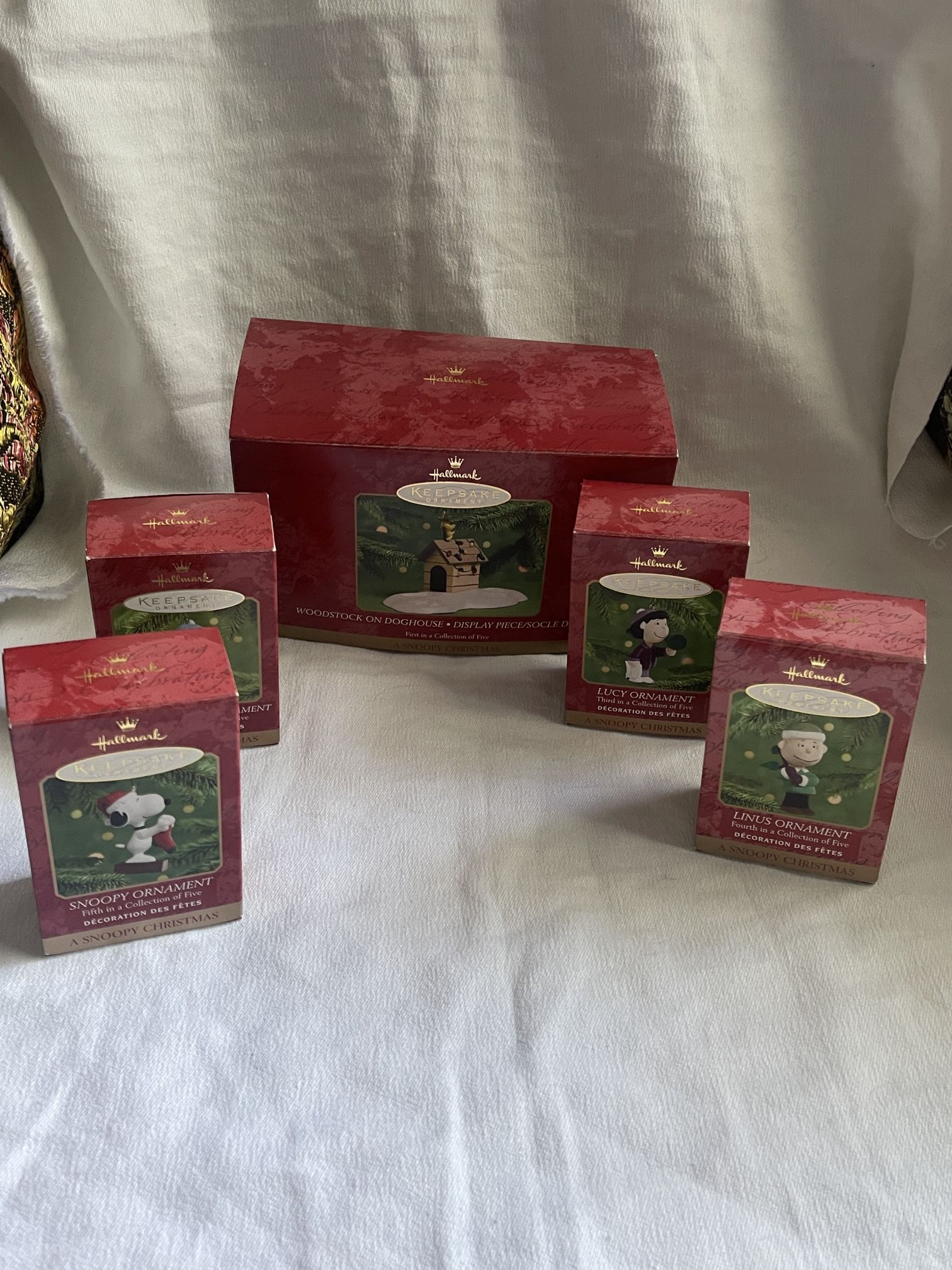 This is a Hallmark Keepsake ornament display piece called "Woodstock on Doghouse," which is the first in a collection of five pieces for the "A Snoopy Christmas" set. • Product Name: Hallmark Keepsake Ornament "Woodstock on Doghouse" Display Piece • Collection: "A Snoopy Christmas" o • Year: 2000 e • Artist: Bob Siedler • Details: The display piece features Snoopy's doghouse with Woodstock on top, holding a star. The other four ornaments in the collection— Snoopy, Charlie Brown, Lucy, and Linus- All new in boxes with collectors club cards Will ship when paying with Venmo or Zelle. For 6.50 shipping OfferUp no longer offers shipping