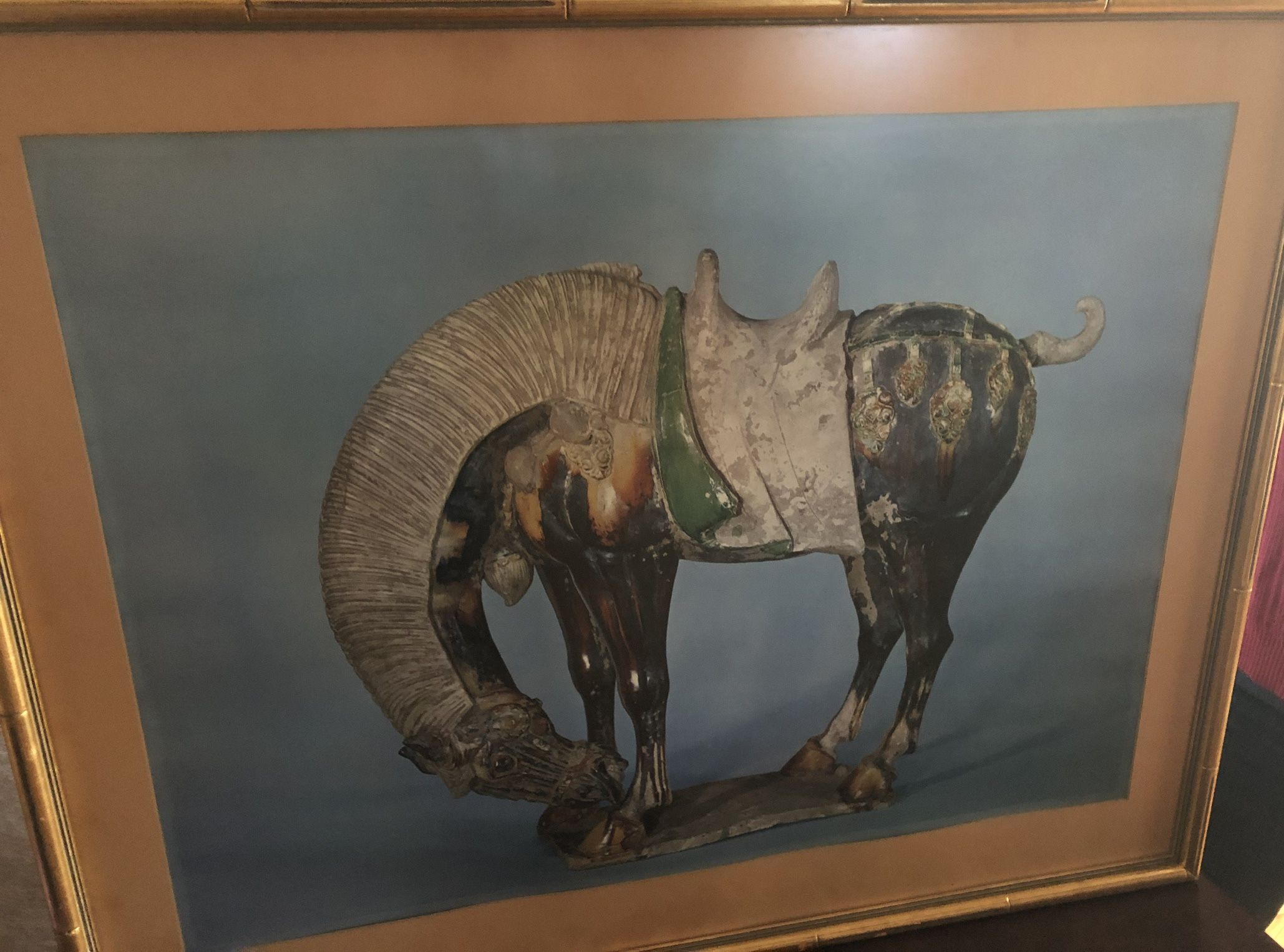 Framed print depicting a pottery figure of a saddled horse. Gold frame. Matted. Back of frame includes information about the original artwork. Image from The Art Institute of Chicago.