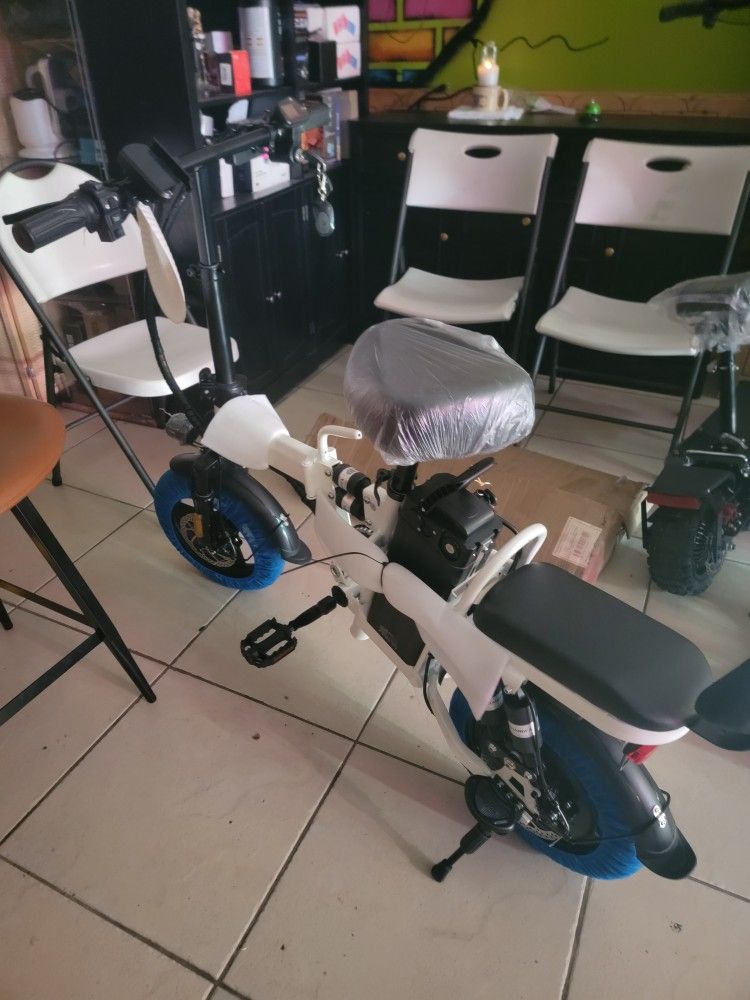 Pick up only 30 to 40 Miles Range with assist Up to 26mph speed Foldable Extra rear seat Has charger Has key and remote with alarm Front light, horn and turn signals I have it new in box Can be assembled