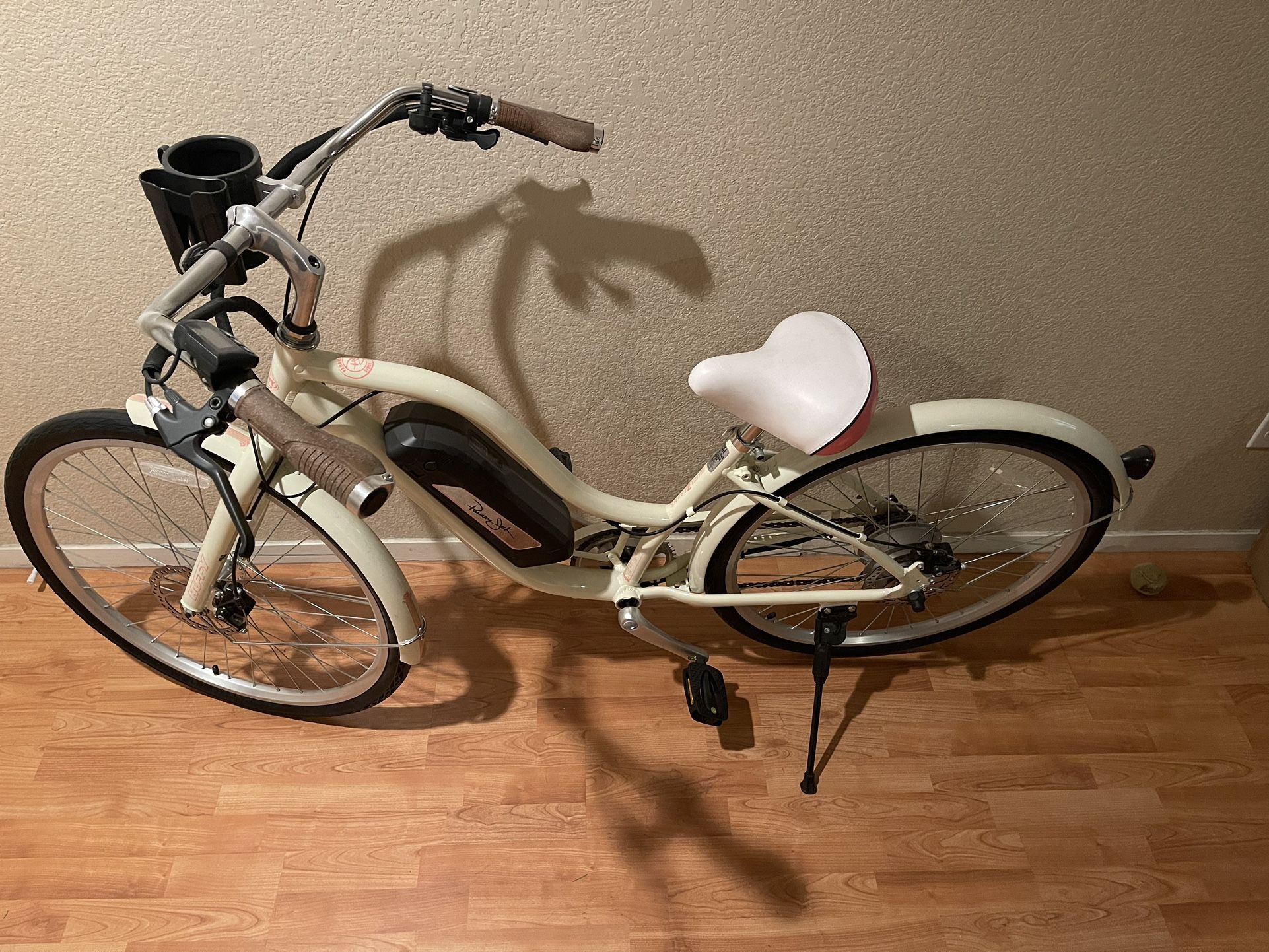 Panama Jack Women's 27.5" Electric Comfort Bike, Ivory, 36V Bought in August Never driven Keys, charger, bike lock, cup holder, and helmet all included