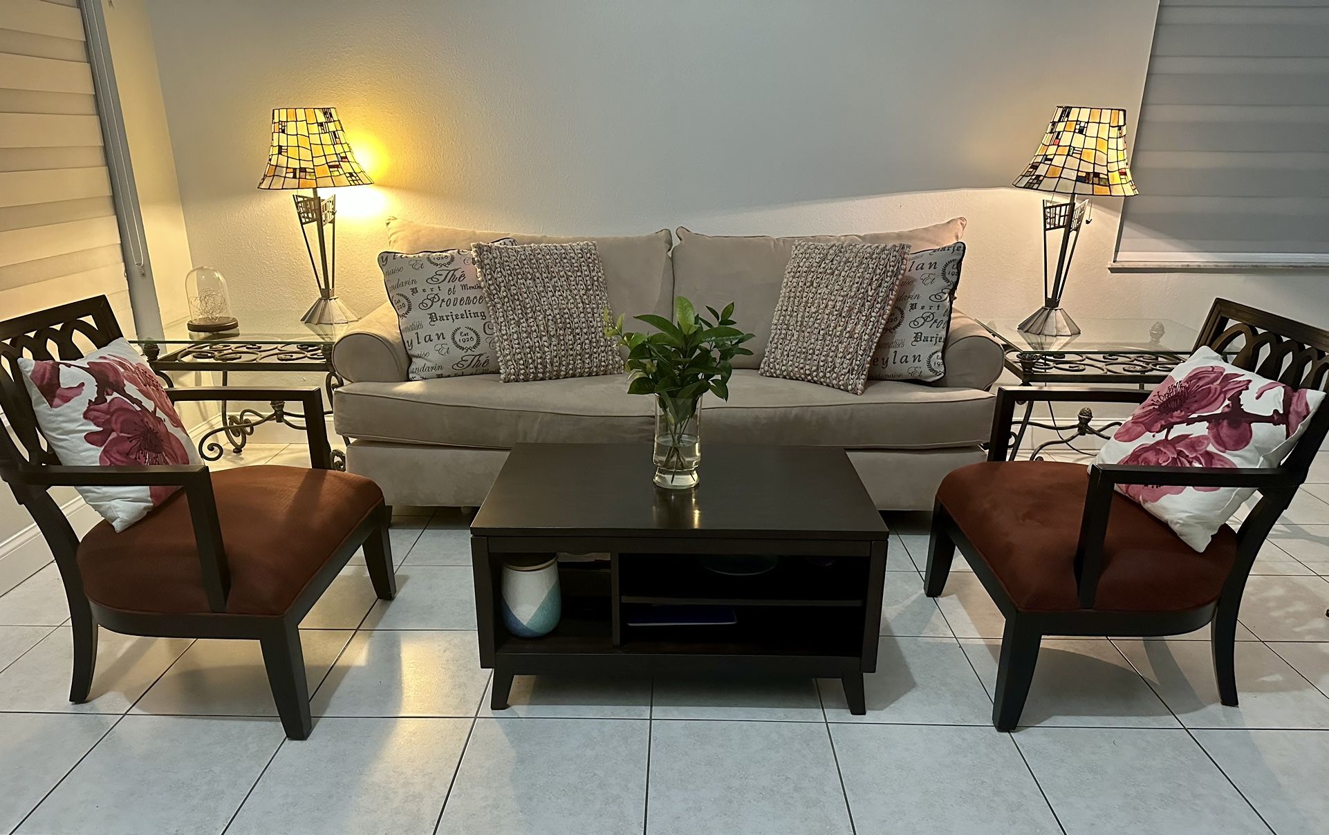 Couch with 4 pillows, coffee table, 2 accent chairs with 2 pillows, 2 side tables (glass top with metal frame). Lamps NOT included.