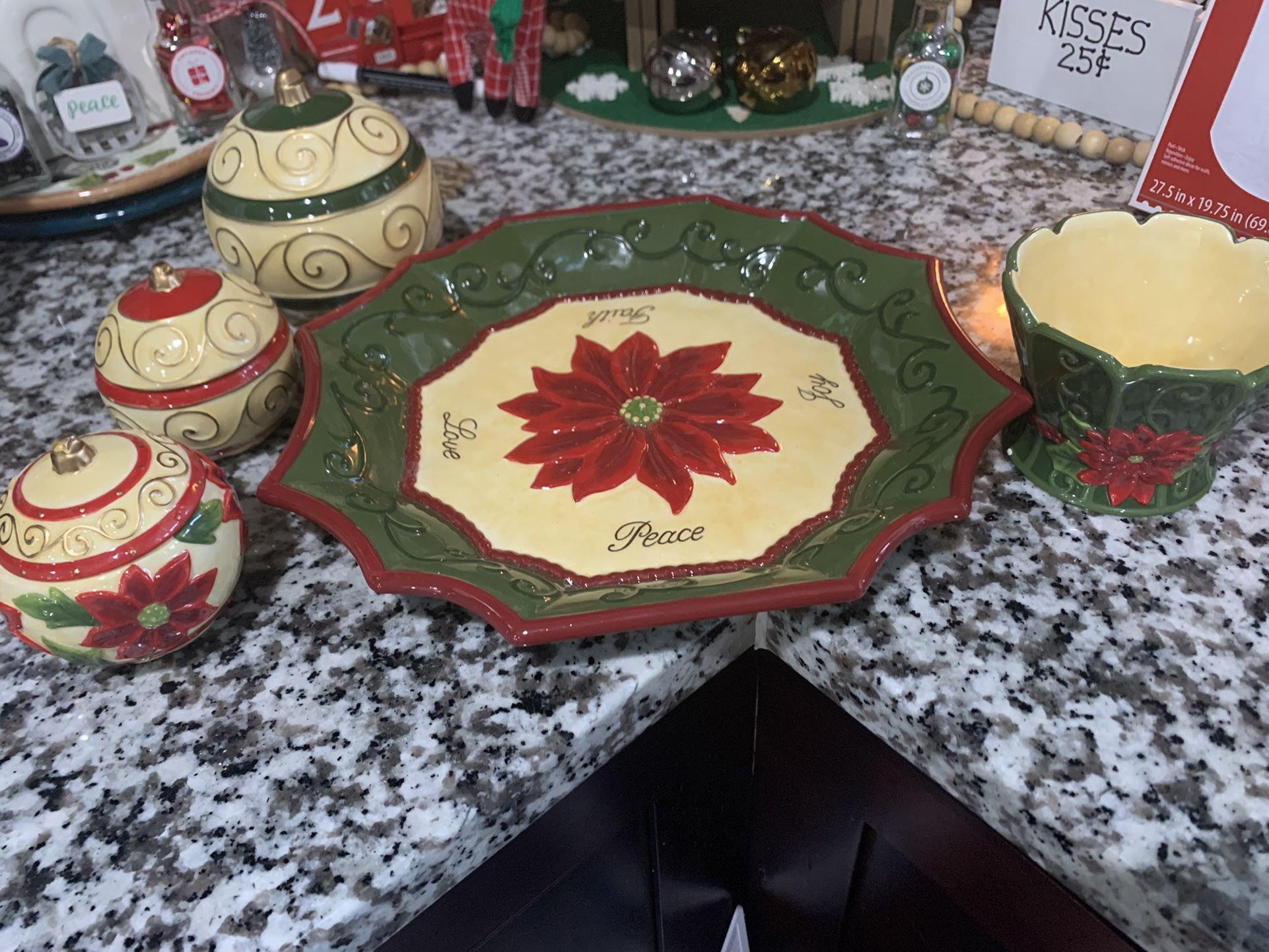 8 piece set all for $5 Only used to decorate table for the holiday 10 1/2 “ plate two very minor paint chips 4” x 3” candle holder two chips (Two) 2 3/4” x 3 3/4” ball ornament dishes with lids Large 5” x 4” ball ornament dish with lid