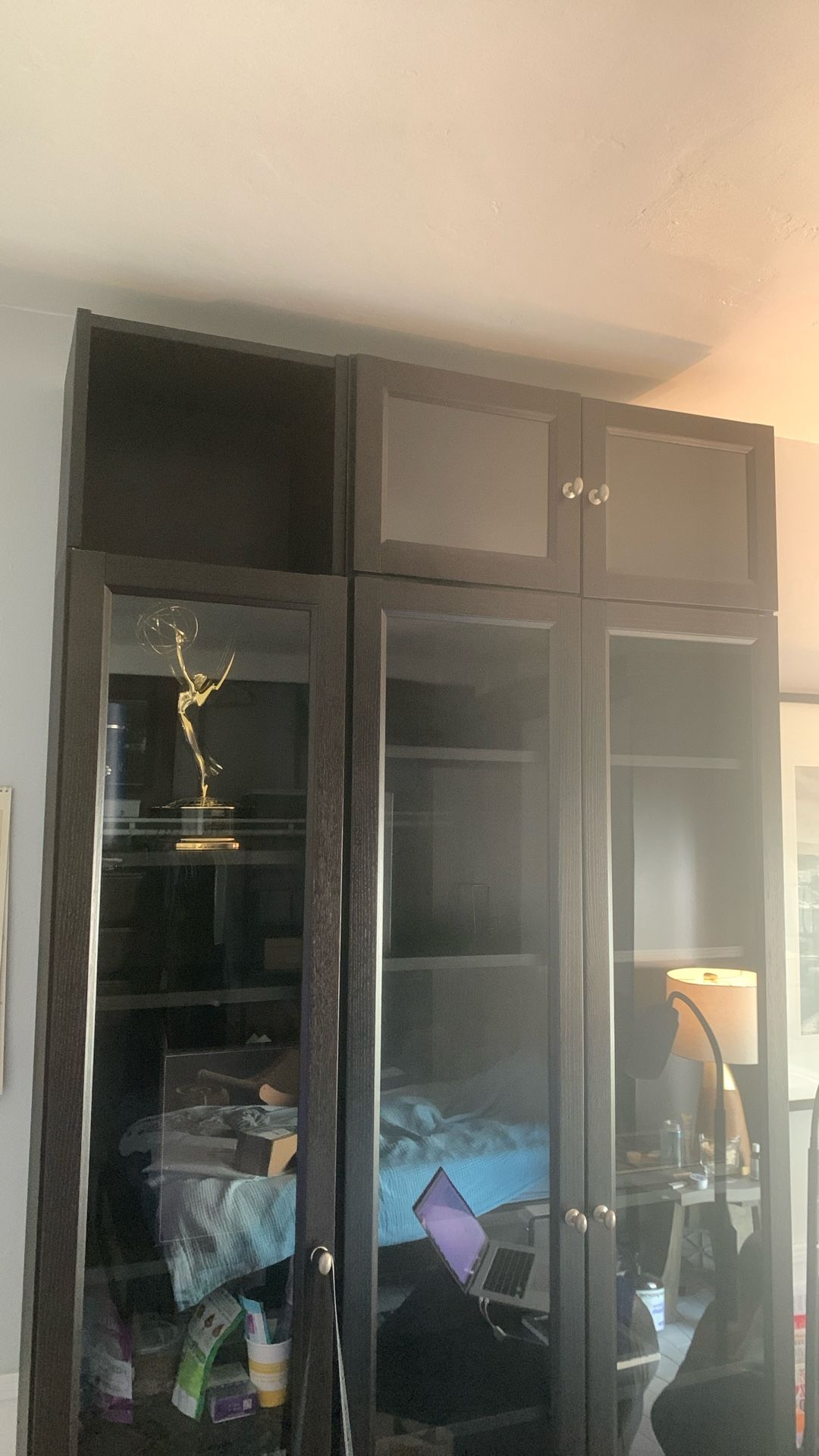 IKEA Bookcase with Glass Doors in “Black Oak Effect.” 1 Double Cabinet w/ Height Extension 1 Single Cabinet w/ Height Extension ** For all measurements please see photo with dimensions ** Cabinets have GLASS DOORS with the single extension cabinet OPEN. CURRENT 2026 cost of this combination at IKEA is $428 + tax. The bookcase is in excellent condition I’m reducing a lifetime of possessions to two suitcases so I can travel the US / Internationally on the cheap. Only furnished apartments from here on out, so EVERYTHING must GO. I have always taken GREAT CARE of my things and have had some of my possessions for decades. CHECK my other listings to see everything for sale -- MORE ITEMS coming in the next week. CASH PICK UP Kk