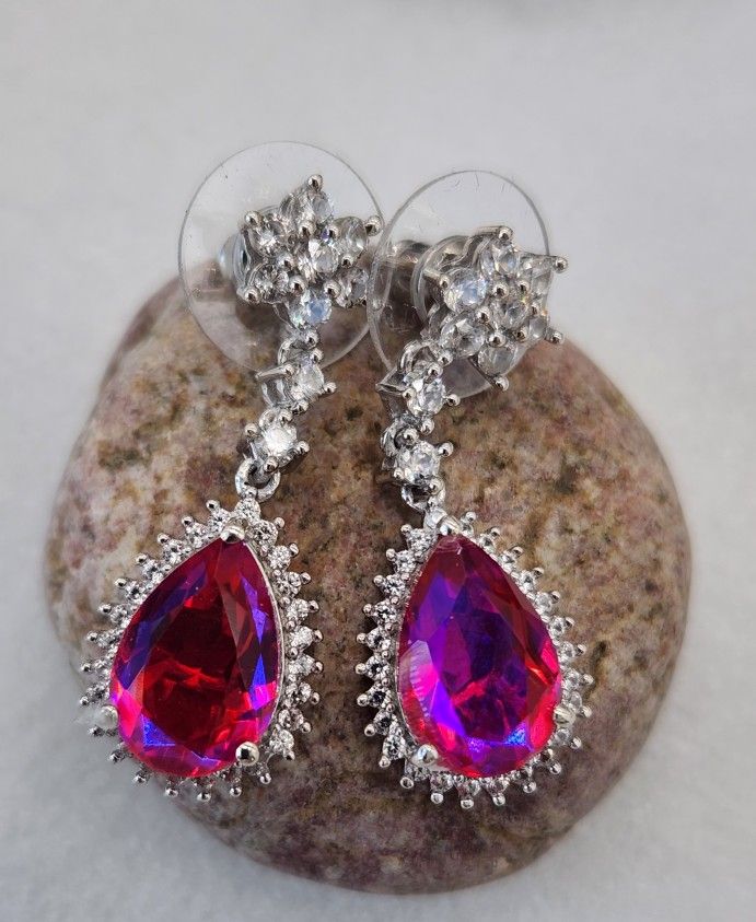 Volcanic Quartz, White Zircon. Earrings Platinum over Sterling Silver. Volcanic Quartz Pears (12×8) mm. White Zircon Rounds. Prong Set. Gorgeous Volcanic Quartz Color's Intense Electrifying Pink's Reds Energized Jolting Purple's. White Glittery Glitzy Zircons. Dangles Articulation Sassy Flirty Cheeky Chic. Lively Vibrant Bold. New. Shipping box included.