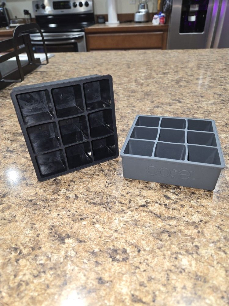 Set of silicone whiskey ice cube trays in black and gray. Makes large cubes. Good condition with light water marks. Clean and ready to use. Pickup or shipping available. Open to offers.