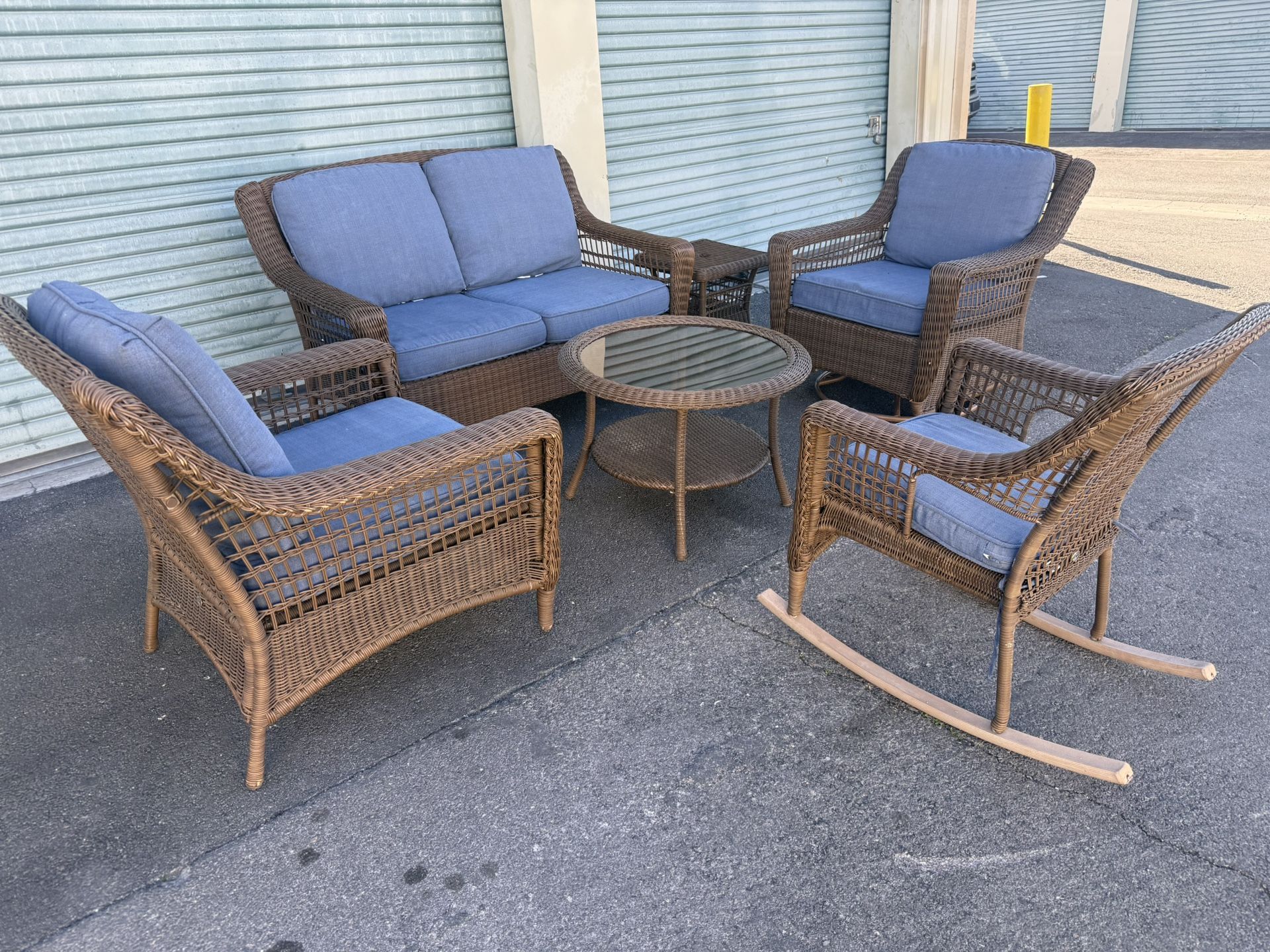 Used 6 pieces Hampton bay outdoor furniture 1 loveseat 1 club chair 1 rocking and swivel chair 1 rocking chair 1 coffee table 1 side table Delivery π available