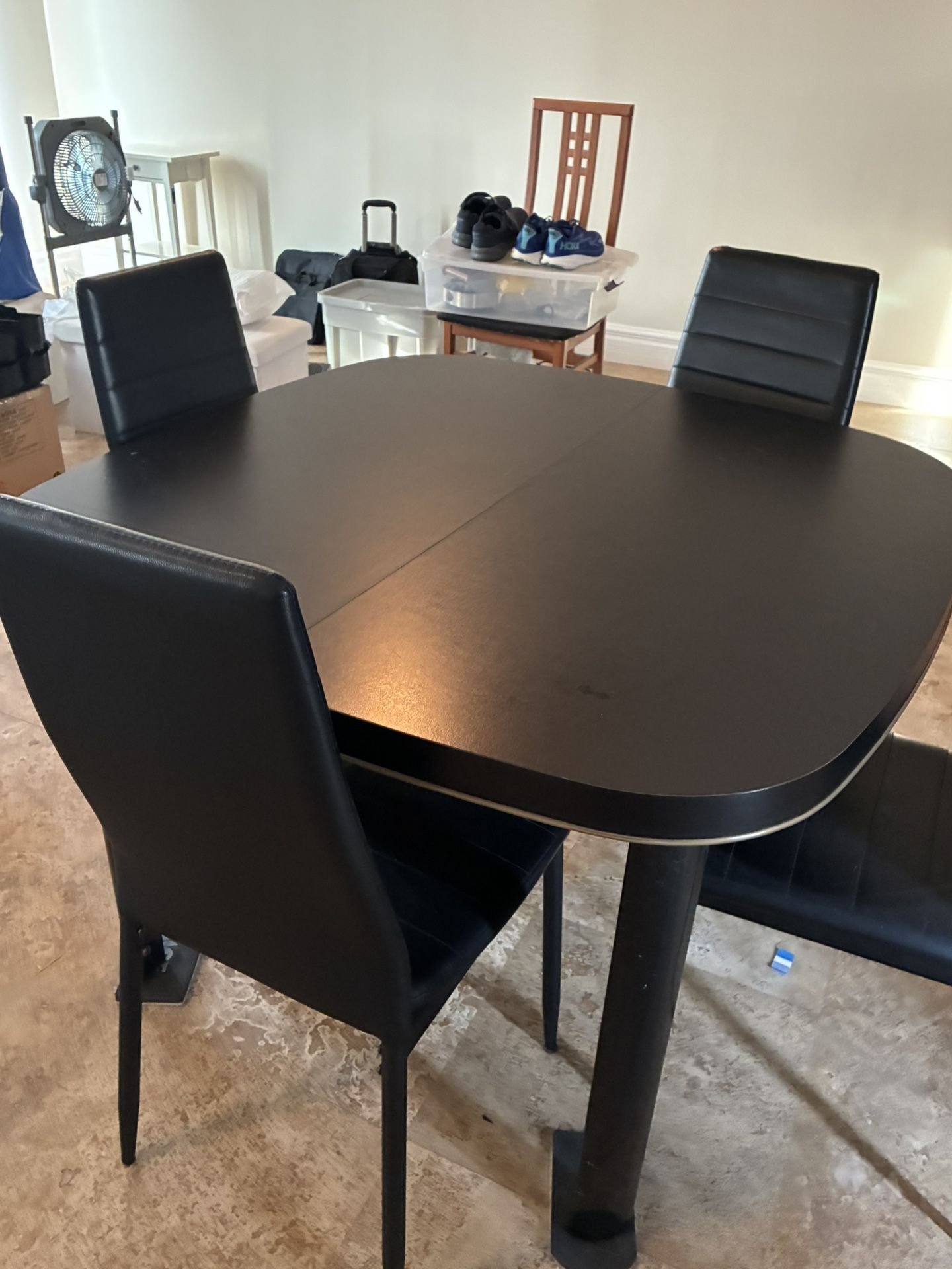 Black. Seats 4 to 6 people. Chairs included.