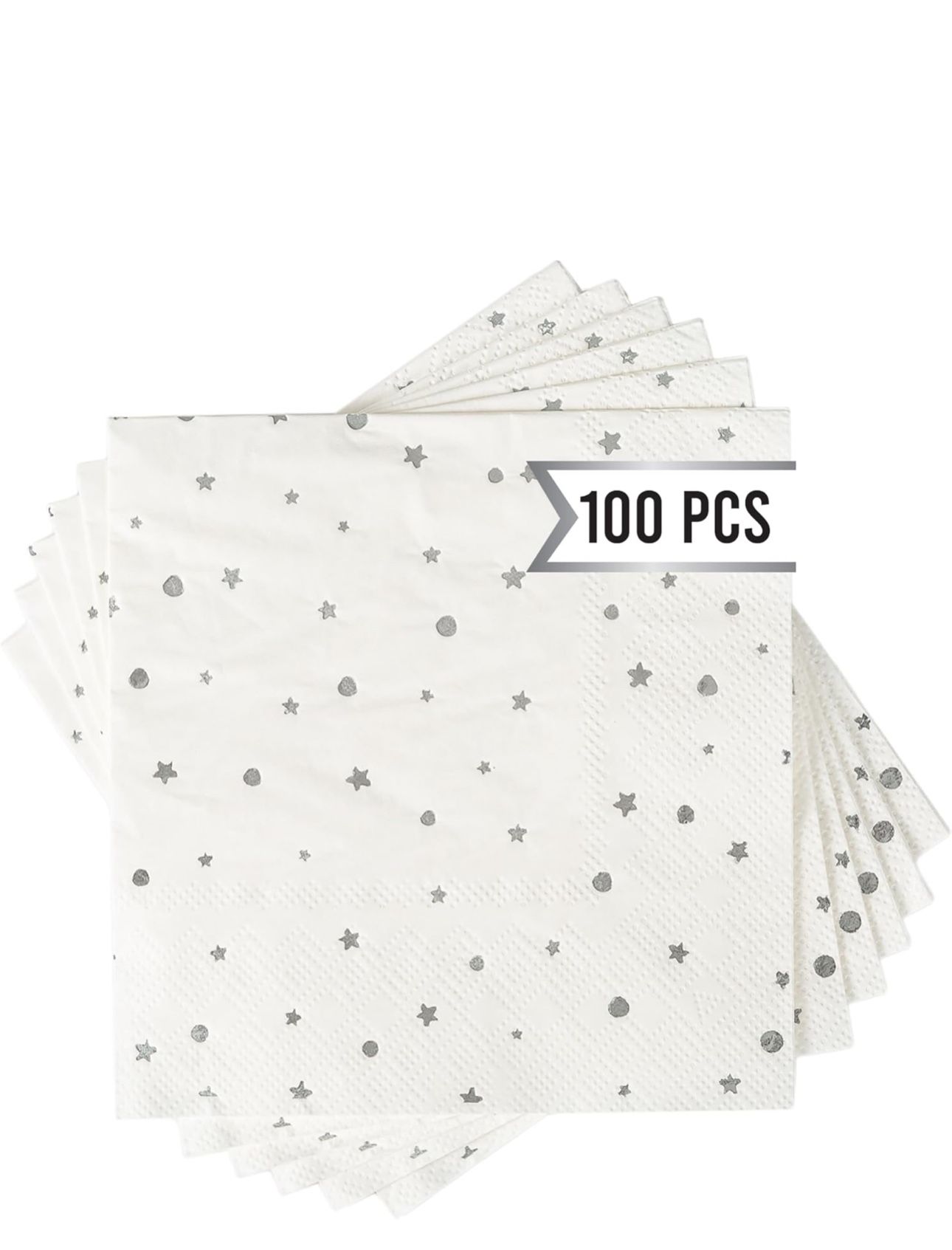 200 White & Silver Cocktail Napkins, Disposable, Star Confetti Design