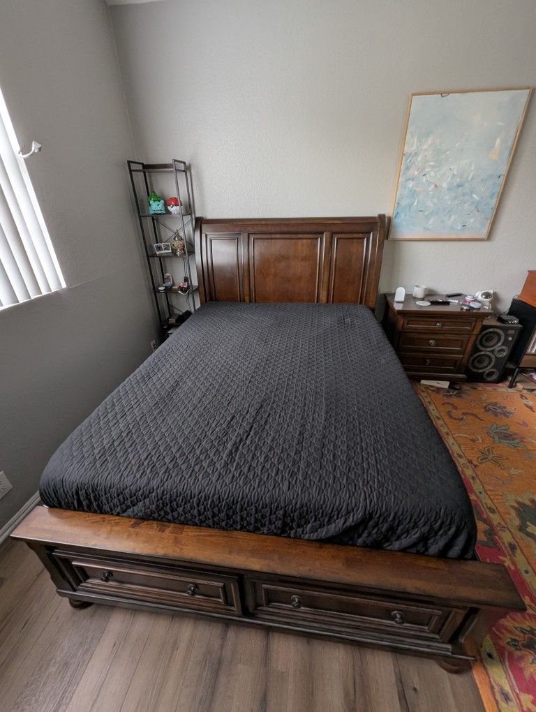 Beautiful and sturdy queen-size wooden bed frame in an antique cherry finish. Includes two spacious built-in storage drawers at the foot of the bed – perfect for keeping extra bedding or clothes organized. Sleigh-style headboard adds a touch of elegance. Dimensions: 82” L x 62” W x 57” H Mattress not included Gently used and in excellent condition Originally purchased at Ashley Furniture for $1,178.70 Available for pickup only. First come, first served!