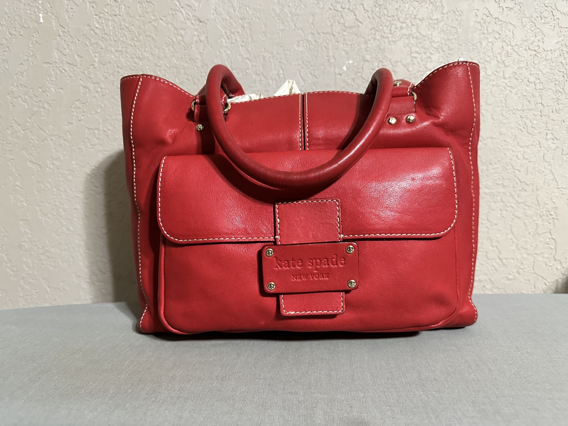 Great condition, no visible defects, shows a bit of wear. Circa 2008 red leather bag. Measures about 12”x9” with a 9” handle drip. Divided inside, middle pocket with zip. Pockets and storage on either side. One metallic snap pocket on front. Gold hardware. Cotton lining