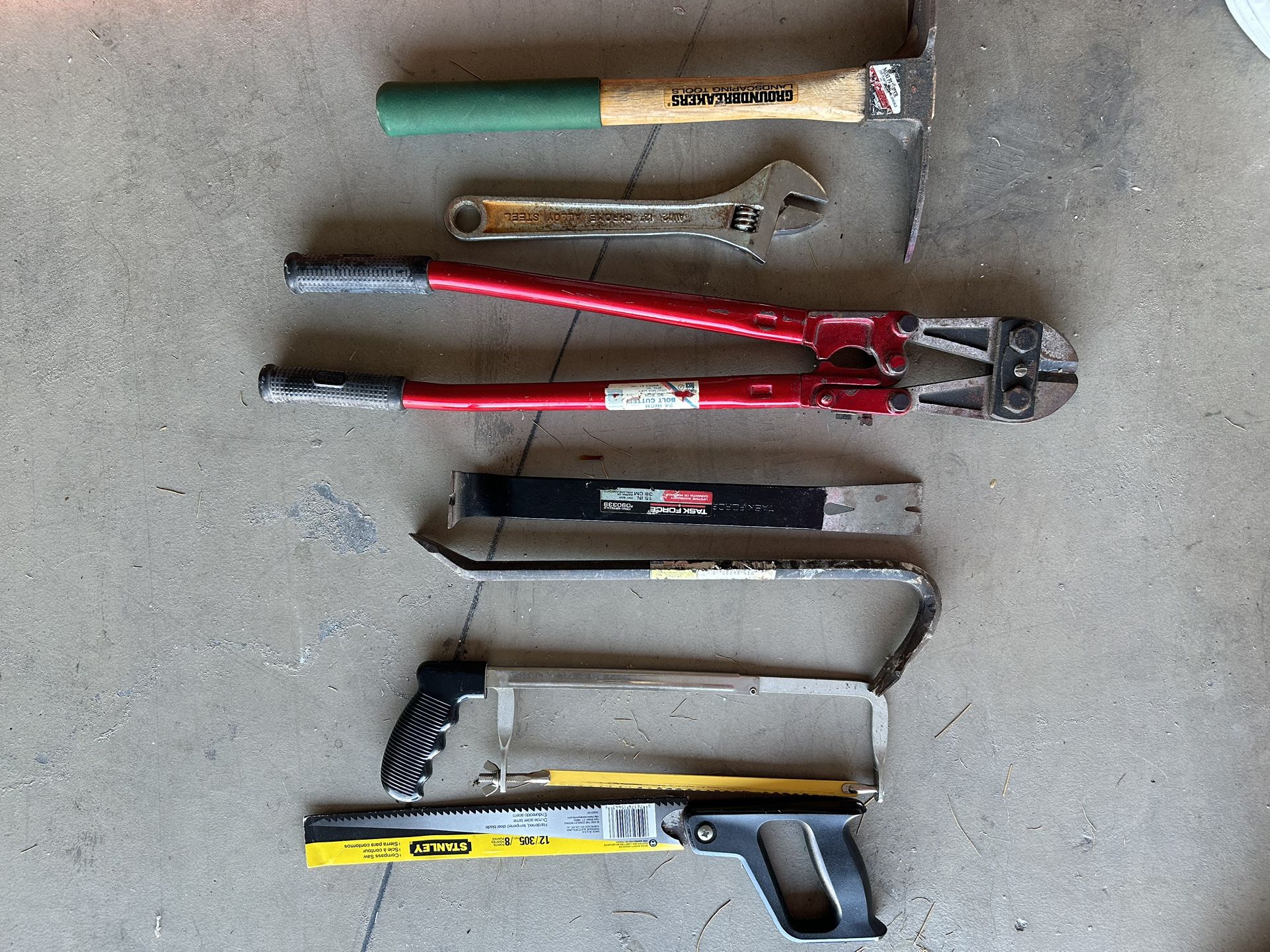 total $30. Wrench, garden pick, hack saw, key hole saw, bolt cutters, pry bar and crow bar